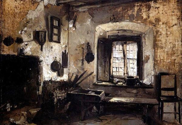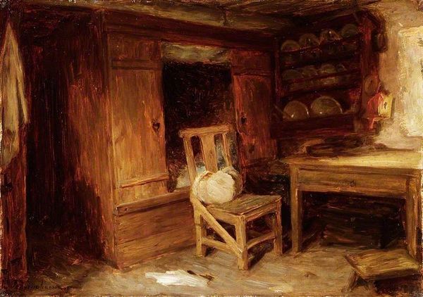 Editor: Eastman Johnson’s 1875 oil painting, "The Other Side of Susan Ray's Kitchen - Nantucket," presents a rather subdued scene. It is a dim, domestic interior. What do you find most interesting about this painting? Curator: Well, consider the materiality itself. The wood paneling, the roughly hewn furniture. It speaks to the labor involved in constructing this space, the lives lived within. What kind of labor produced that lumber, crafted those objects? Was it local, regional, perhaps relying on networks of trade and resource extraction we rarely consider? Editor: That's fascinating. I was focused on the light, but thinking about the labor embedded within the materials is new to me. So, how does that shift your view? Curator: It draws attention to the social context. This isn't just an idyllic scene. It’s a constructed environment reliant on systems of production and consumption. And the composition directs our eyes to every detail made of materials. Notice how light only graces them. Where is the food production itself, and what does that tell us about the place of “women’s work?” Editor: I see what you mean. It invites a much deeper interrogation of daily life in 1875. Do you think Johnson was making a specific commentary? Curator: Perhaps, but it's more powerful to consider how the artwork *itself* functions as a record. Look at the way the paint is applied! We see brushstrokes, the physicality of oil paint rendering the scene. It's not a transparent window; it is made, constructed with intention but equally revealing its own material processes. The sheen on the table begs questions: how many hands built it, cleaned it? Editor: So it’s almost like the painting documents both a physical space *and* the labor connected to it? Curator: Precisely! And by extension, the social relations surrounding its creation and existence. It gives us new eyes into the kitchens, tables, homes and labour involved that shaped lives in Nantucket in 1875. Editor: That really gives me a lot to think about. Thanks so much!