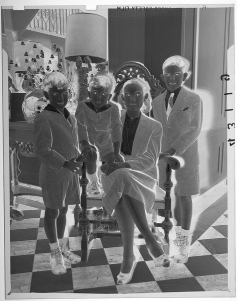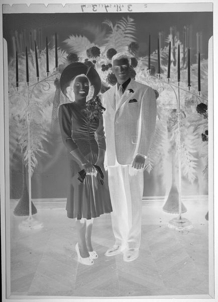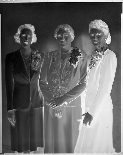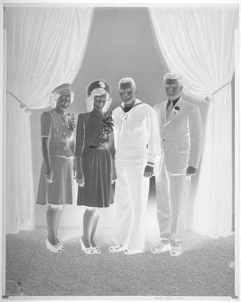 Editor: This is an intriguing photograph by John Deusing, simply titled "Untitled (two men and two women posed in suits in studio)." What I find immediately captivating is how the figures, though posed, seem to hold a certain enigmatic distance. What's your take on this composition? Curator: It's almost as if they’re ghosts caught in a moment, isn't it? Given the lack of a date, I find myself wondering about the context of the image. Are we seeing the formal wear of a specific era, or perhaps a subtle commentary on social roles? It feels like peering into a bygone era, a touch haunting, don't you think? Editor: I do now! It makes me think about how much a simple pose can tell a story, even when we don't know the specifics. Curator: Exactly! It's a reminder that art isn't just about what we see, but about what we feel and imagine.