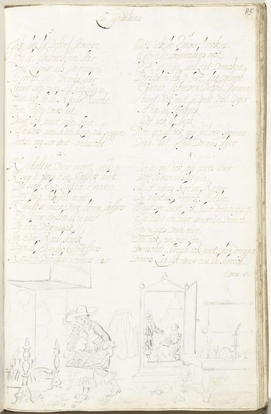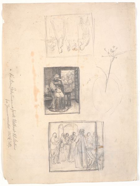 Editor: This drawing, titled "Market Scene with Arguing Women," was created around 1650 by Samuel van Hoogstraten. It's rendered in pencil, ink, and watercolor, and you can almost feel the tension radiating off the page despite its simplicity. What elements of this work stand out to you? Curator: What fascinates me is Hoogstraten's deliberate use of humble materials - pencil, ink, watercolour on paper - to depict such a bustling, human scene. It raises questions about the market itself as a site of production and consumption. Consider where he obtained his materials. Who made the paper? Who ground the pigments? Editor: That’s interesting; I never really think about those kinds of details! Curator: The roughness of the sketch also challenges the typical polished finish we often associate with Golden Age paintings. This almost 'unmediated' access to the making process speaks to the increasing market for art at this time, where even sketches held value. Is it a study for a larger work or something else? Are these women selling items themselves, perhaps produced by family labour? Editor: So, by focusing on the materials and the artistic process, you're highlighting how this piece reflects broader economic and social conditions of 17th-century Dutch society? Curator: Precisely. It encourages us to move beyond aesthetic appreciation and examine the socio-economic context within which it was produced. Editor: That perspective completely shifts my understanding of the drawing! It makes you wonder about the story *behind* the scene, not just the scene itself. Curator: Absolutely. Considering art this way allows for new and exciting interpretations. Editor: Thanks. I learned how thinking about process and material brings more depth to what I see.