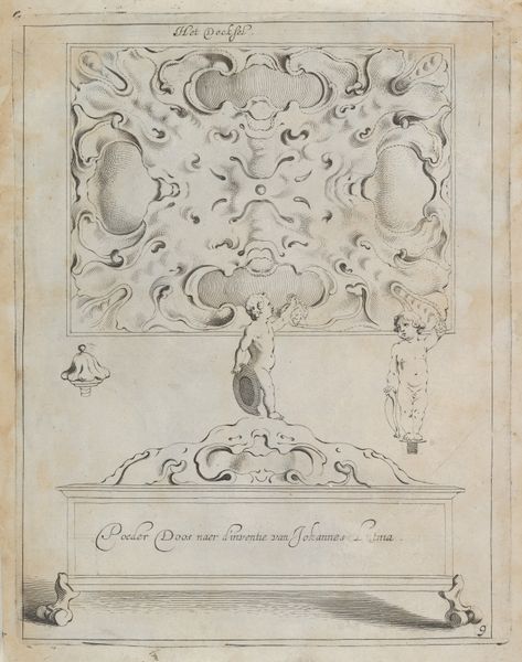 Curator: This is "Vignetter til Wiborgs digtsamling: En Molaccord" created by Georg Emil Libert in 1842. It's an engraving done in ink on paper. The title translates roughly to "Vignettes for Wiborg's Poetry Collection: A Minor Chord." Editor: It certainly strikes a somber note. The intricate border work, almost thorny, seems to confine the narrative vignettes. The limited color palette further emphasizes a subdued, melancholic atmosphere. Curator: It's part of a larger cultural and political context. Denmark was grappling with national identity in the face of external pressures and internal reforms. Libert’s piece connects to themes of longing and loss prevalent in the Romantic period, reflecting the poetry of Wiborg and its relationship to questions of identity and historical consciousness. Editor: I see what you mean. There’s a tension created by the high level of ornamentation – look at those flourishing vegetal scrolls—surrounding scenes depicting what appear to be intimate moments of family and maybe societal dysfunction. Are we to read the natural world, idealized in the embellishments, as being at odds with lived human experience? I wonder if that tension is highlighted through printmaking. How were such images circulated? Were these included within printed poetry volumes? Curator: The artist, Georg Emil Libert, plays with shadow and composition, evoking profound questions concerning human condition. He seems fascinated by liminal spaces - both physically in terms of rooms with barred windows as well as conceptually, reflecting the in-between states of love and rejection, innocence and experience, which are echoed throughout the entire poem of Wiborg. The angelic figures hovering in the scene point toward deeper concerns too, don't you think? Editor: Absolutely, that relationship of life with religious elements certainly is a factor. These reproductive prints democratized access to artistic representations in Denmark, helping shape a collective identity among people from varying social and economic background as new media. How accessible these poetic visions really were beyond urban areas is also important when one analyzes these illustrations from a Materialist position. Curator: Considering the complex socio-cultural factors interwoven into this single drawing really amplifies the emotional resonance that goes way beyond personal feelings of longing. Editor: Right, observing how a tangible artistic method allowed for the broad propagation of artistic, philosophical and politically tinted concepts completely changes our way to see and experience an artwork.