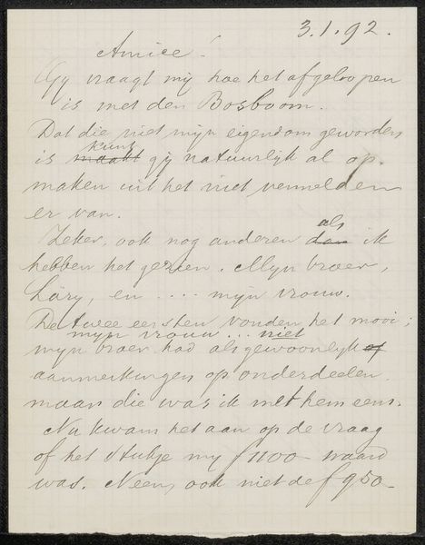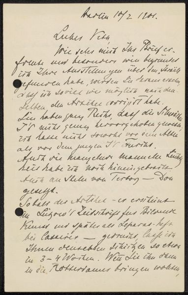 Editor: Here we have "Brief aan Jan Veth," a pen and ink drawing, potentially from 1898, by Max Liebermann, housed at the Rijksmuseum. It's fascinating – the whole piece is handwritten German text, with some words underlined! What do you see in this work? Curator: What I see is an intersection of art, craft, and social exchange. It's not just a letter; it’s a material object infused with the personalities of Liebermann and Veth, who was himself an artist and critic. Let's consider the date, likely 1898 – German Expressionism was bubbling, a movement partly fueled by anxieties about industrialization and alienation. How does this hand-rendered letter challenge ideas about mass production and standardization? Editor: I guess it emphasizes the personal connection between the sender and receiver, pushing against the impersonal nature of, say, printed text. The very act of handwriting makes it intimate. Curator: Exactly. It’s an act of resistance, almost. Think about the labor involved, the deliberate formation of each character. In what ways does Liebermann assert his individuality and artistic sensibility within the conventions of letter writing? Is it simply functional, or is it making a statement? Editor: I think it blurs that line, because you can admire the craft, the penmanship. The form becomes inseparable from the content. It seems very intentional that this ordinary means of communication becomes elevated, an expressive object. Curator: Yes, we shouldn’t disregard its place in a conversation between two artists in a complex socio-political moment. How might it be different than a quick, utilitarian email? The contrast reveals what’s really significant about artistic exchange and, beyond that, personal correspondence in a rapidly changing world. What have you discovered through our talk? Editor: How handwriting elevates it beyond pure communication. The message is secondary; the artistry is foremost. Curator: I'm also struck by the power of personal connection within an historical setting; the very artifact testifies to it.