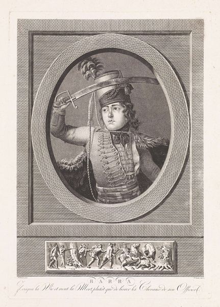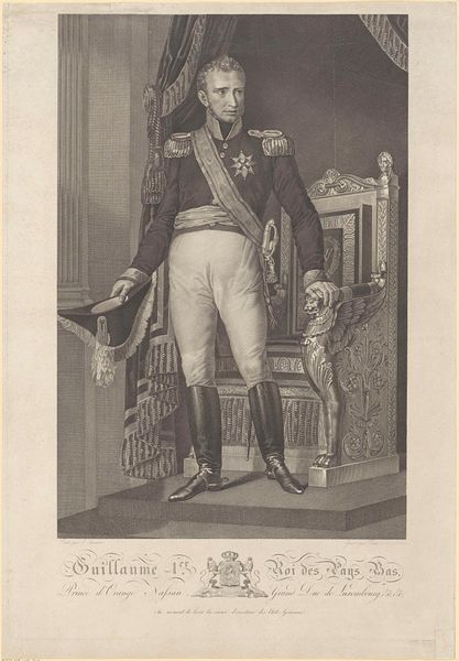 Curator: This is a portrait of Willem II, King of the Netherlands, an engraving created sometime between 1813 and 1834. The piece resides here in the Rijksmuseum collection. Editor: Immediately striking, isn't it? There's such deliberate visual language. The crisp lines, the military imagery, all creating a feeling of formality and power. The crown and the battle scene at the bottom really amplify that sentiment. Curator: Indeed. Engravings like these played a crucial role in shaping public perception during the era of nation-building. Willem II, as a national hero, needed a strong visual identity. The inclusion of those battle scenes isn't just decorative; it’s a direct reference to his military prowess. Editor: Precisely! It’s interesting to unpack the weight of the symbolism. The oval frame surrounding the portrait is adorned with laurel leaves, emblems of victory and honor—classical iconography used to subtly legitimize his rule and connect him with an idealized past. And notice the small scene depicted below? What historical event does it reference, do you think? Curator: My suspicion would be an echo of the Battle of Waterloo and Prince Willem’s involvement; the imagery would likely appeal to national pride, reminding viewers of Dutch contributions to European security after Napoleon's defeat. Editor: I agree completely. And look closely at Willem's expression. Despite the regalia and martial context, there is a youthfulness and vulnerability in his gaze, a subtle suggestion of character beyond the crown. It provides psychological intrigue. Curator: Good observation. What's fascinating to me is the interplay between personal portrayal and public image here. Willem isn't simply rendered as a ruler, he's fashioned into a figurehead representing national aspirations and anxieties during a period of significant change. Think about this being displayed in civic spaces. Editor: This is very thought provoking. The work becomes more than just a portrait of a man; it turns into a potent emblem of an evolving national identity—layered with symbol, history, and perhaps a bit of wishful thinking. Curator: It really allows us to reflect on how power and national narratives are constructed, and how visual art became entangled with this. Editor: Definitely something to mull over. These historical symbols have the power to spark conversation, all these years later.
