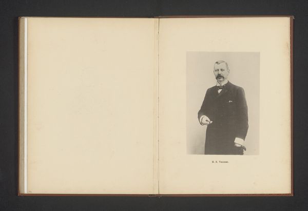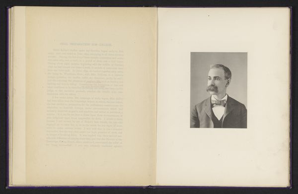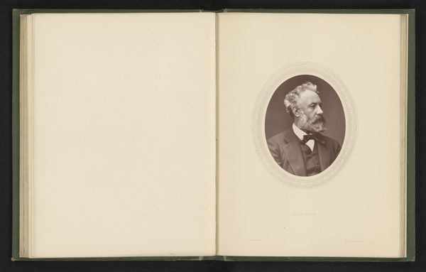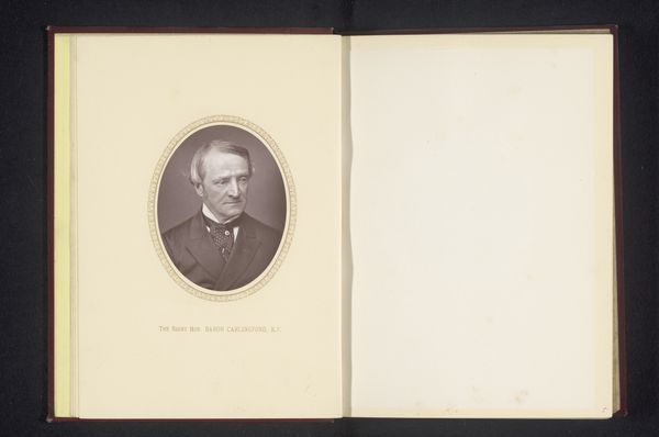 Curator: This intriguing image presents us with a portrait of Earl Cairns, dating to before 1881. It's ink printed on what appears to be aged, perhaps even homemade, paper. Editor: Immediately, I'm drawn to the paper itself! It looks almost velvety, like you could reach out and feel its history. The portrait gives off a serious vibe – very "Victorian gentleman." Curator: Indeed. The image provides a window into Victorian society and its reverence for figures like Cairns. His portrait, embedded within this particular paper, speaks to notions of permanence, legacy, and the construction of historical memory. We can think about the power structures that enabled and sustained his prominence. Editor: Totally. And, honestly, that font underneath the portrait – so ornate! It almost feels like they’re trying a bit too hard to scream “important!” But I do like how they chose to frame the image inside the right page. There is another full, empty, left side page of this beautiful book. Curator: Exactly! The placement elevates the subject, reinforcing the established hierarchies. However, consider also how the very choice of paper – potentially homemade, or deliberately aged – might be subtly challenging those same rigid structures. It introduces a handmade, somewhat vulnerable quality, a potential fissure in the veneer of unyielding power. It makes me consider who made the book! Editor: That’s interesting. I'm just struck by how much quieter and smaller and vulnerable it feels to me now! I almost feel like making a collage on that blank space on the left! The crisp emptiness is quite suggestive. Curator: I agree; the book’s format as a whole creates a juxtaposition of power and fragility. This tension mirrors larger societal conflicts inherent to the late 19th century: between tradition and modernity, stability and revolution, visibility and erasure. Editor: I didn't think a simple book opening could say so much! Looking closer really did open it all up! Curator: Yes! I think that through a work like this, we gain insights into Victorian values while acknowledging the era’s internal contradictions. Editor: Definitely more to it than just a stern face on paper, isn’t it?