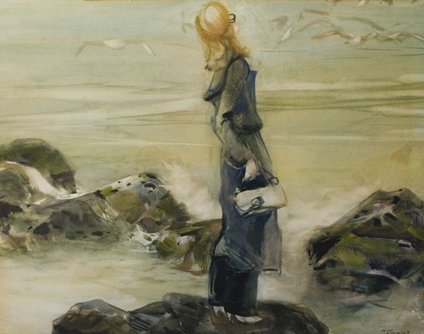 Editor: Here we have "Ophelia by the brook – Act IV, Scene VII, Hamlet" by Edwin Austin Abbey, likely a painting on paper from around the turn of the 20th century. The scene feels… delicate, fragile even. Almost like a half-remembered dream. What does this scene evoke for you? Curator: Ah, yes, Ophelia. This rendering of Shakespeare's tragic figure is a wisp of a memory. Edwin Austin Abbey captures a moment of utter vulnerability. I’m struck by how he uses watercolour to suggest transience. The colors seem to bleed and weep into each other just like our tears! Doesn't the composition strike you as somewhat unbalanced, perhaps echoing her unstable mental state? Editor: I see what you mean – she's not quite centered. I guess that contributes to the sense of unease, that something is… off. I find myself drawn to the color palette – soft pastels juxtaposed with that stark, looming tree. What does that contrast signify to you? Curator: Exactly! The soft pastels lend a certain pre-Raphaelite prettiness – a dangerous beauty, masking the grim reality of her situation. The tree... well, that's her impending doom, isn't it? Solid, unyielding against the ethereal quality of Ophelia herself. Almost a looming, judgement. You know, it makes me think of our own attempts to grasp at beauty even amidst terrible sadness. Doesn't it? Editor: That’s a very powerful thought. It does kind of highlight that constant tension between beauty and tragedy. Curator: The entire scene becomes a haunting poem, doesn’t it? Abbey masterfully makes us feel the poignant dance between reality and oblivion in poor Ophelia’s world…and ours. Editor: Absolutely, and now, I definitely see more of Ophelia's fragile mental state. Thanks for that reading!