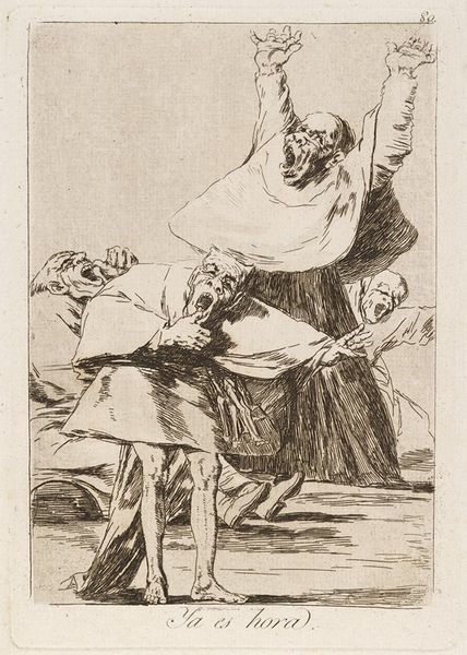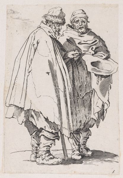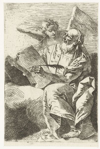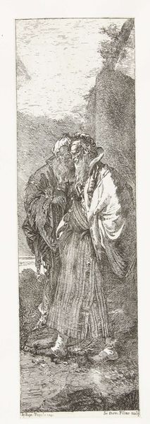 Curator: This print, created by Giovanni Domenico Tiepolo after 1755, is titled "Two Old Men." It is currently held at The Art Institute of Chicago. Immediately, I'm struck by the image quality. How could an etching—such an industrial medium—produce something that feels almost intimate? Editor: It's compelling how Tiepolo leverages the etching technique to convey a sense of aged fragility. Look at the labor required: each line carefully etched onto the metal plate. You can almost feel the craftsman’s hand meticulously documenting these figures. What’s the power dynamic at play here? Curator: Power and age are very interesting when seen through Tiepolo’s socio-political milieu. Note their garments; they suggest a specific class. Who were the elder members of Venetian society after 1755 and what role did they fulfill as repositories of knowledge in the wake of the enlightenment? Editor: Exactly, their clothes indicate something. And it is paper--it's an accessible medium. We’re confronted with an idea that information should spread through the people—consider then that printmaking exists in between industry and accessibility for the masses, what ideas were circulating, and for whom? Curator: Their close physical proximity makes me wonder what they are discussing. It has all the trappings of an old-world meeting, possibly plotting some social maneuver. Perhaps we need to view the image in tandem with larger themes that surround ideas of masculinity and aging, too? How might such ideas become unstable? Editor: I’m compelled to think about where the labor originates; in what social class and under what kind of industry? The marks, the cross-hatching… It’s fascinating how the artist balances precision and suggestion to render both form and texture and I wonder: do we assign too much weight to these kinds of depictions today? Curator: Absolutely. In a time of intense and sometimes facile democratization, looking back at the nuances with which older structures communicated becomes even more valuable, for the way they allow us to scrutinize our own assumptions and behaviors. Editor: The intersection of materiality, labor, and distribution of images make us aware of our historical position today and its specific conditions. Thanks for expanding my knowledge around the significance of this artwork.