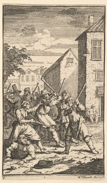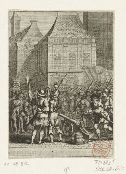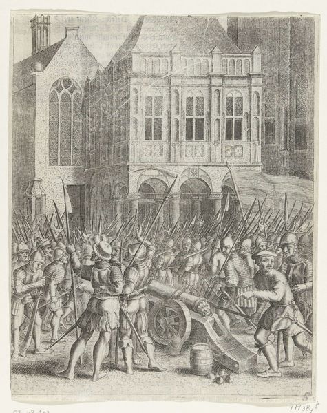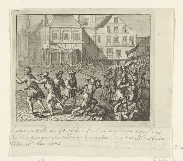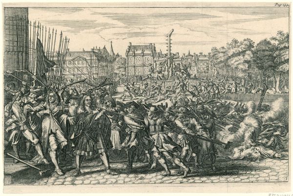 Editor: This engraving, "The Anabaptists Occupy the Dam Square, 1535," was created between 1657 and 1659. The scene is quite chaotic and violent. What larger stories do you think are at play here? Curator: Well, the image depicts a key moment of religious and social upheaval. Given its historical context, it invites a reading of power dynamics and resistance. Consider the Anabaptists: they represented a radical, marginalized group challenging established religious and political norms. What do you observe about the way they are portrayed? Editor: They're clearly outnumbered, and the violence seems very one-sided. Curator: Exactly. The artist, though anonymous, likely had a specific perspective on this event. The image implicitly comments on social order, the suppression of dissent, and perhaps even the complexities of religious freedom in 17th-century Dutch society. Think about the Dutch Golden Age – a period of great prosperity, but also religious tension. What do you think this engraving might be saying about that tension? Editor: It makes you wonder about whose stories are being told and whose are being silenced. Was this a cautionary tale? Curator: Precisely. Or perhaps a subtle critique of the powers that be? It's important to consider the social function of history paintings. They weren’t always objective records but were often used to reinforce certain ideologies or narratives. Looking at this with a contemporary lens, how can we use it to explore themes of oppression and the fight for social justice that resonate even today? Editor: This has really made me think about the layers of meaning in what I initially saw as just a historical scene. Curator: And that's the beauty of engaging with art. It’s never just about what we see on the surface, but about understanding the deeper historical and social currents at play.