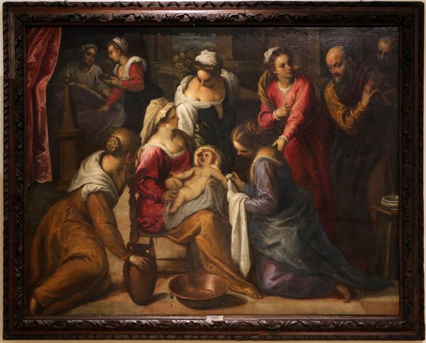 Domenico Fiasella's painting, "famiglia di abramo," presents a somber scene dominated by earth tones, punctuated by the reds of garments and subtle light falling across faces and hands. The canvas is divided into two distinct registers, each conveying different emotional weights through its composition. The figures on the left are grouped tightly, creating a sense of bustling activity. This contrasts with the more isolated figure of Abraham, positioned to the right, whose contemplative posture introduces a note of reflection. The interplay between these groups sets up a visual dialogue within the painting, hinting at the tensions of familial duty and individual plight. Fiasella uses the stairs to frame and separate Abraham from the other members of his family, reinforcing this sense of isolation. This staging not only invites viewers to consider the composition, but also to question the semiotics behind familial and spiritual narratives. The painting becomes a site for negotiating meanings, challenging us to reflect on its cultural and philosophical discourse.