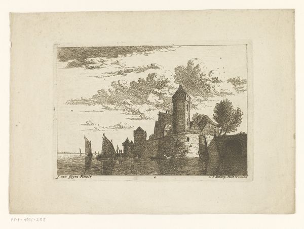 Editor: We're looking at "Forum Romanum," an etching by Etha Fles, created sometime between 1867 and 1948. It has this incredibly somber feeling to it. The sky is heavy, and the etched lines create a textured surface that seems almost gritty. What strikes you about this piece? Curator: The compositional elements are quite compelling. Note the tonal range, primarily grayscale, that creates atmospheric perspective and directs the eye. The texture arises from the etching technique, specifically, the layering and varying depth of the etched lines. Are you picking up on how the horizontal lines across the top play against the verticality suggested by the buildings below? Editor: I do now! It’s like a contrast between the enduring architecture and the transience of the sky. But, what's the effect? Curator: It establishes a visual dynamism that is intriguing. The relationship between line, tone, and texture converge to create that sombre mood. We should observe that there are strong horizontals but also there are clear implied verticals. How would the composition change, in your opinion, if one dominates over the other? Editor: I see, it could make the piece feel much more static or unbalanced without the dialogue of vertical and horizontal. Thank you! Curator: Consider how semiotics allows us to decipher layers within, where forms, materials and techniques convey meaning about enduring forms, in visual terms.