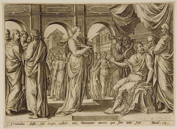 Editor: This is Agostino Veneziano’s "Death of Ananias," an engraving of considerable drama. I'm struck by the contrast between the figures collapsing in the foreground and the seeming indifference of those on the platform. What power dynamics are at play here? Curator: It certainly depicts a stark power imbalance. Consider the historical context: religious authority, the early Church exerting its dominance. How does the artist visually represent this authority, and who is excluded from it? Editor: The figures on the platform are elevated, literally and figuratively. The reactions seem performative, meant to enforce norms. Curator: Precisely. And what about the figures attending to Ananias? Are they rebelling or submitting? Consider the role of complicity within systems of power. Are they agents of their own, or forced participants? Editor: I hadn't thought of it that way. It makes me wonder about the individuals caught in the middle, then and now. Curator: Art encourages us to investigate such complicity, to resist easy answers. It's not just about the past; it's about power today.