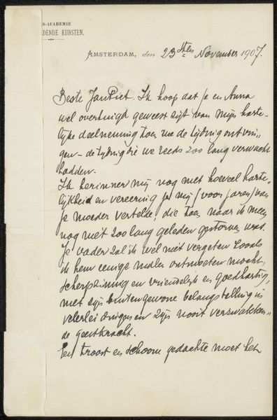 Editor: So this is "Brief aan August Allebé" – possibly from 1909 – by Antoon Derkinderen. It's ink on paper, so, just a letter really, but it's in the gallery as a drawing. I am struck by the elegance of the handwriting; it feels so personal and crafted, even though its function is purely practical. What do you see in it? Curator: I see the commodification of correspondence. The act of handwriting becomes a performance of artistry, elevating a mundane object into a displayable artwork. Note the date, 1909. Mass production, and therefore wider consumption of cheaper paper and inks, was changing written communications. Derkinderen uses this medium as a subtle protest against this transition. How does this challenge our understanding of “drawing” versus “writing”? Editor: That's fascinating! I hadn't considered the social context of its production. So you are suggesting that by framing it as art, it elevates and gives value back to what was once, even then, commonplace and becoming devalued with mechanization? Curator: Exactly. Think about the materiality – the specific ink used, the texture of the paper. Each choice contributes to its meaning and how it stands in opposition to mass produced materials. Are there similar parallels with, for example, political pamphlets of the time, or commercial communications such as advertisements? How are these forms using the same or different materials? Are the materials themselves designed for longer life and preservation or not? And why? Editor: I see what you mean. The way he painstakingly formed each letter is now screaming out to me. I originally saw it just as simple beauty of handwriting, but now understand the social messaging is much deeper when looking at how the materials are working. Curator: Precisely! Thinking about art this way makes us question not only *what* is art, but *how* and *why* it's produced and then consumed, or indeed conserved in our case here, right? Editor: This perspective has really opened my eyes to the art and function inherent in everyday materials. Thanks!