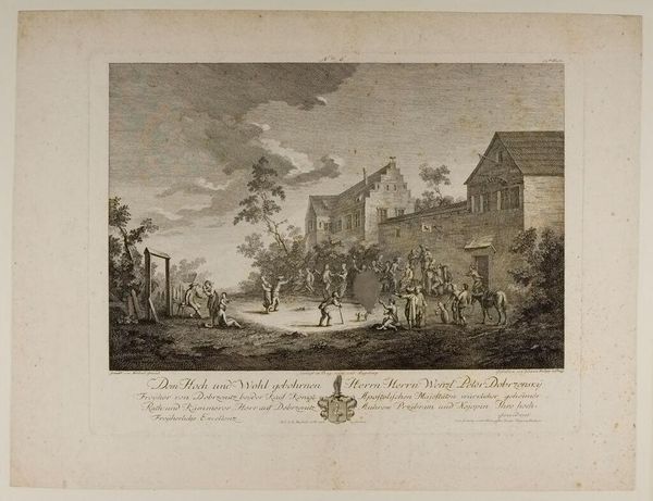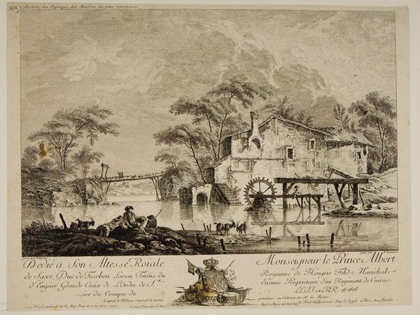 Curator: Ferdinand Landerer, born in 1730, is the artist behind this etching, simply called "Landscape," now part of the Harvard Art Museums collection. Editor: There’s a certain stillness to it. The figures almost blend into the architecture and the land itself, but at the same time, it feels staged. Curator: Notice how Landerer meticulously details the textures—the rough stone of the buildings, the water's surface, and even the cloudy sky. I'd argue that the labor involved in creating such intricate detail through etching elevates the image beyond a simple depiction of nature. Editor: I see a commentary on social hierarchies; the working class depicted alongside figures who seem to be observing the landscape from a position of leisure. The composition feels carefully constructed to reinforce these divisions. Curator: Indeed, the printmaking process itself made art accessible to a wider audience. This challenges the notion of art as a precious commodity available only to the elite. Editor: Absolutely. By capturing this scene and reproducing it, Landerer contributes to the ongoing visual narratives that shape our understanding of class, labor, and landscape. Curator: A fascinating intersection of craft, social commentary, and visual culture! Editor: It certainly gives a lot to think about, even with its quiet surface.