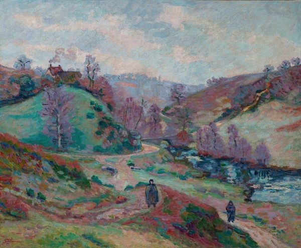 Editor: This is Armand Guillaumin's "Paysage De Crozant," painted in 1922. It's an oil painting, a landscape. I find the color palette very striking and a bit unusual – there are so many purples and greens. What strikes you when you look at it? Curator: The dominance of purples, as you noted, certainly commands attention. In many cultures, purple is associated with royalty, spirituality, and the liminal space between worlds. Here, it blankets the hills, suggesting perhaps a landscape that is both earthly and transcendent. Notice how it contrasts with the verdant foreground. What feelings does that contrast evoke in you? Editor: It makes the landscape feel vibrant, but also a little dreamlike, because I'm not used to seeing those colors in that quantity in nature. It's as if it is familiar, but not at the same time. Curator: Precisely! And consider the cultural memory associated with landscapes. For centuries, landscapes have represented not just physical space, but also emotional and psychological states. The vibrant colors could reflect a sense of hope after the devastation of World War I, with the natural world presented as a source of healing. Do you see any symbolic forms or motifs within the brushstrokes themselves? Editor: Now that you mention it, the way the paint is applied in short strokes – it gives a sense of constant movement, as if the landscape is alive and breathing. It seems the world is pulsing with energy. Curator: Yes! The visual symbols here, especially through the energetic brushwork, invite a feeling that we're glimpsing a deeper truth, the essence of nature itself. I'm glad to have the opportunity to consider that question! Editor: I agree. Considering the symbolic weight of something like the color purple makes me appreciate this painting in a completely new light!