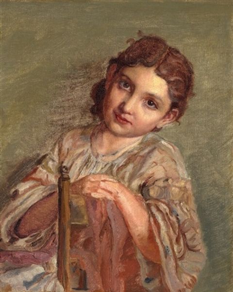 Curator: Edward Mitchell Bannister painted this genre scene in 1882, an oil on canvas entitled, "Child with Birds and Dog." Editor: Oh, it feels like a stolen moment, a hushed tableau. The girl, barefoot, clasps the birds. She seems more like a woodland sprite than a proper Victorian child. Curator: Indeed, that tension between realism and romanticism is present. Consider Bannister's position as an African-American artist in the late 19th century. Genre paintings like this allowed him to navigate the art world, offering sentimental scenes while perhaps subtly critiquing societal constraints. Editor: It's interesting that you frame it like that; I immediately wondered about the dynamic of power. The child has the birds cupped in her hands, there is the reclining dog that seems indifferent, and the birds above feel unbothered. Is she trapping these elements of nature or nurturing them? It feels both tender and…slightly ominous? Curator: It’s about access, maybe. As a Black artist painting predominantly white subjects, he may be commenting on the relationship between innocence and power, who gets to capture beauty and what that capture truly means. The domestic space becomes a site of both comfort and subtle control. The way that you describe it also points to a wider trend in his body of work to interrogate societal and racial stratifications. Editor: Yes, there’s a kind of melancholy too. A lot of browns and grays muddled with those dreamy, hazy shades of sky and wildflowers...it evokes both a tangible sense of time and something else, fleeting and dreamlike. Curator: I'm glad you felt that, it might even be read as a pastoral critique, highlighting how the ideal of childhood innocence intersects with societal structures. Looking at Bannister's wider body of work can give us tools of analysis through gender studies, intersectional understanding of race, and critical theories of societal progress in a post-bellum U.S.. Editor: So, we begin with what seems like an innocent scene and discover it has so many layers... Who knew a little girl and some birds could carry such a weighty story! Curator: Exactly. Art has the power to reveal so much more than meets the eye.