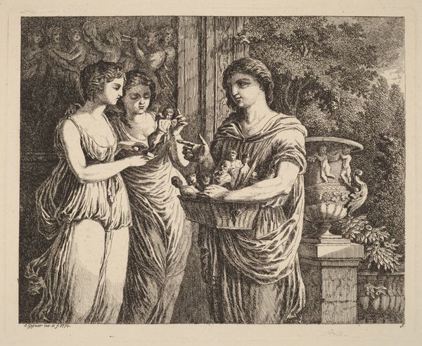 Célestin Nanteuil made this print, "The Fountain," using a technique called lithography. This method allows artists to create images on a flat stone or metal plate, and then transfer them onto paper. Notice the dense, almost velvety blacks achieved through this medium. The velvety blacks define the contours of the figures, the subtle gradations of tone in the surrounding landscape, and the cascading water. Lithography allowed Nanteuil to capture the play of light and shadow, lending the scene a sense of depth and atmosphere. This print belongs to a broader history of experimentation with reproductive technologies in the 19th century. Lithography democratized image-making, enabling the widespread dissemination of art and illustrations beyond the traditional realms of painting and sculpture. This had profound implications for both artistic expression and popular culture. It blurred the lines between original artworks and reproductions, challenging notions of authorship and value in art. Ultimately, "The Fountain" invites us to consider the material and social forces that shape our understanding of art.