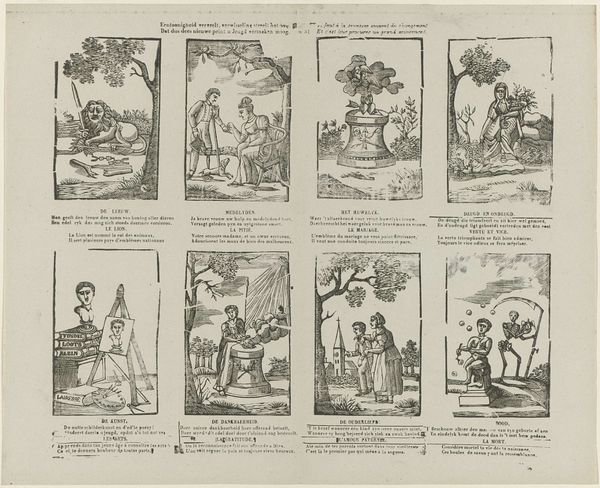 Editor: This delightful engraving, "Ziet deze prentjes, lieve kindren (...)", likely created between 1791 and 1812 by Jacobus Thompson, presents a series of charming scenes. There's something quite captivating about the way these little vignettes are framed; they remind me of looking through a child's storybook. As someone relatively new to art history, I’m curious about what this artwork conveys to you? Curator: It speaks volumes about the public role of art at the turn of the 19th century. These kinds of prints, disseminated widely, functioned as accessible visual culture. Consider how the choice of scenes - genre paintings depicting everyday activities, folk art traditions – shaped the worldview of its viewers. Were they aimed at children, as the title suggests? What did these images teach them about the social order? Editor: The title seems like a straightforward hint, but were images for children common at that time? Was it trying to instill moral lessons, or was there another objective? Curator: Images aimed specifically at children were gaining traction, but we must analyze beyond face value. This print presents occupations and perhaps even social classes. How are these groups depicted? What social messages are implicitly reinforced? Think about who controlled the means of production for such images and how their agendas may be present in the imagery itself. Editor: It's intriguing to consider that this seemingly innocent print might subtly promote existing power dynamics, showing people at work, almost to illustrate their value. So, beyond their visual charm, these prints functioned as vehicles for reinforcing social structures. I never would have seen it that way. Thanks for the new insight! Curator: Precisely. By interrogating the socio-political forces at play, we move beyond appreciating just the artistic execution to understanding the historical weight and purpose of visual culture.