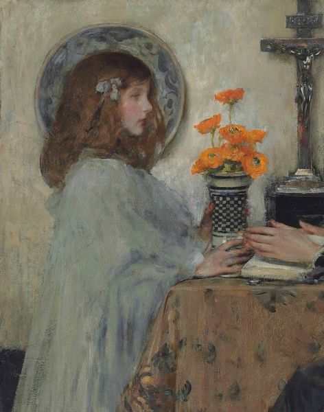 Editor: Thomas Wilmer Dewing's "A Reading," painted in 1897, presents two women in a muted, almost dreamlike setting. The composition is dominated by the table, creating an interesting division of space. What can you tell me about it? Curator: Well, let’s think about the time it was made. The late 19th century witnessed shifting roles for women in society. The act of reading, depicted here, gains importance. Is it a symbol of independence, intellectual freedom, perhaps access to progressive thought, or merely a cultured pass-time? The way in which art institutions showed this sort of work impacted the public's understanding. Editor: That's fascinating! I hadn't thought about the social implications of reading itself. Curator: Precisely. Paintings like these, showcased in prominent galleries and exhibitions, shaped perceptions of ideal womanhood. What does the restrained palette and quiet composition convey, then? How might this image have reinforced or challenged the accepted gender norms of the time? Editor: It seems like both reinforcement and subtle challenge. The intimacy feels progressive, but it’s also very controlled. It lacks dynamism; I’d imagine a curator then would consider this as representing feminine poise, yet they also have these knowing looks on their faces. Curator: Good eye. What if this knowing look actually *creates* agency within the painting? Does Dewing's artistic circle add context to our reading? Who bought this, how was it seen, and what effect did it have? Editor: Wow, that adds another layer to the piece. Considering its reception is super interesting! Curator: It is crucial. It encourages one to reconsider our initial interpretations of Dewing's painting in its cultural context and also within today's values.