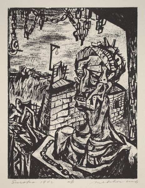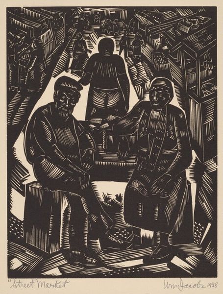 Curator: What a powerful piece! We're looking at Charles Turzak's "Workers II Alternative," a woodcut print created around 1934. It really embodies the Social Realist style of the time. Editor: Stark. The high contrast is immediately striking. It’s a strong image, full of contrasts both dark and light that amplify this impression of a muscular and determined working class. Curator: Absolutely. Turzak used the woodcut medium to its fullest extent, simplifying forms to create a compelling image and the stark black and white, I believe, highlights the core materials of its production, wood, ink, paper – it speaks to the directness and accessibility that Social Realism championed, especially during the Depression era. Editor: Notice how these figures – the manual laborer with his hammer, the skilled worker, and the intellectual with an open book – all loom from the print? The book, significantly, carries what looks like a laurel wreath. What are they meant to be gaining through knowledge? The whole tableau speaks volumes, with visual symbols loaded with optimism that work betters existence. Curator: I'd agree. You know, this was a period when art became closely linked with progressive social movements, like worker education programs which really aimed to empower the labor force. Considering that workers at the time had limited exposure to art in general and fine arts were mainly produced by wealthier patrons who sought different forms of representation, this really shifted production towards workers instead of more traditional and higher society themes and purposes. Editor: Fascinating! Turzak isn’t merely showing laborers toiling. He suggests that education is an intrinsic part of workers finding and defining themselves. Hilda W. Smith's calligraphic inscription below the figures confirms the association of progress through “courage, beauty, strength.” Curator: Well, examining the historical moment in terms of available materials for arts, especially those which would reach wider audiences... the very process, using a relatively inexpensive printmaking technique made possible wide distribution... The messages it carried then were incredibly influential and relevant in its call for representation of marginalized people. Editor: The symbols embedded in this print are more powerful considering their wider message and history, with connotations that go far beyond Social Realism; I believe "Workers II Alternative" stands the test of time in its narrative as a cultural force for justice and dignity. Curator: Indeed. Considering both material factors and cultural symbols at play offers profound perspectives and informs further analysis!