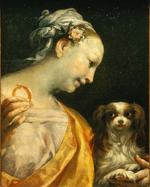 Editor: So here we have *Jeune fille au chat*, attributed to Jean-Baptiste Greuze. It looks like it’s painted with oils, and what immediately grabs me is how tender it feels—this young woman cradling a little kitten. How do you interpret the social significance of a piece like this? Curator: It’s interesting you picked up on the tenderness. Greuze was highly celebrated, and sometimes critiqued, for these sentimental depictions. Consider the context: 18th-century France, the rise of bourgeois values. He catered to a market that valued displays of virtuous domesticity. What does showing a young girl caring for a vulnerable animal suggest about ideal femininity at that time? Editor: That she’s kind, nurturing... maybe it's about moral instruction, too? A reflection of the social expectations of women? Curator: Precisely. And it goes deeper. Genre paintings like this allowed viewers to reflect on their own lives and moral standing. It wasn’t just about surface beauty; it was about presenting aspirational models of behaviour, aligning with Enlightenment ideas of reason and moral progress influencing the culture. Also, how might the rise of Salons – publicly accessible art exhibitions – affect the accessibility and perception of art like this? Editor: That’s true, the salon system gave this more intimate scene a wider audience, didn’t it? Were these paintings, then, partly propaganda, reinforcing societal norms? Curator: The line between genuine sentiment and social conditioning is often blurred. Greuze gives us this image, the public receives and interprets, the critics weigh in, and his patrons approve or disapprove by buying or refusing to buy. Consider how different political regimes utilize visual messaging and understand Greuze as just one example within that legacy. What new things do you notice now? Editor: Thinking about its audience makes me reconsider that feeling of innocence; the composition, her gaze, is more calculated than I first thought. Curator: Precisely. Seeing through a social lens changes everything. It opens up avenues for deeper engagement with artworks. Editor: It makes it more engaging, for sure, to look beyond the aesthetic to question what purpose art like this served in its day, and the ongoing implications and questions about representation of women. Thank you.