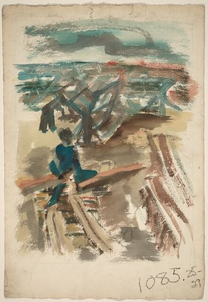 Curator: Gazing at John Marin's "Middle of Atlantic" from 1909, I feel a sense of exhilaration and a slight disquiet, actually. The quick strokes...it's as if he captured the ocean's raw energy and compressed it right there onto the page. Editor: Absolutely. I immediately zoom in on the rapid application of watercolor wash, observe the rough paper. You know, thinking about Marin aboard a ship—the labor of travel, the supplies he needed, the very economy of oceanic crossings at the time—it situates this almost visceral depiction of the ocean. The means of artistic production meets the vastness of the subject, right? Curator: That's it! The almost chaotic strokes mimic the turbulence of the waves. He uses a minimal palette but conveys so much movement. The deck structures— are we seeing glimpses of the ship he's traveling on? He reduces the ocean to simple shapes, the ship to these structural elements... Editor: Exactly, the painting foregrounds these transient elements. We have the artist and the crew. What would that division of labor been like, making an artwork amid such controlled chaos? There's even a nod to a tradition here with Marin. One has to wonder, too, about his relationship to those tools and materials? Was his paper French? I'm always wondering who manufactured this. Curator: Maybe? Regardless, he really takes us into his experience; you feel the boat swaying and creaking in sympathy. But isn't there something quintessentially American in his modernism too? It’s as though the watercolor medium becomes less important than the energy being created. Editor: Yes! It challenges that classical art tradition by capturing this ephemeral state and presenting that moment to us, almost demanding that we acknowledge the work needed to capture such images, and how consumerism impacts his supplies, his travel, and even access to ocean views. Curator: To be honest, it reminds me that, at any moment, even amidst what feels like great solidity, we are ultimately at the mercy of something much greater. It’s quite humbling. Editor: And when looking at pieces such as these, hopefully more visitors like myself question everything a little bit harder as we come and observe the pieces, the travel, the resources, and ultimately who produced this, down to the last bolt, per say.