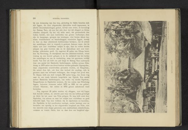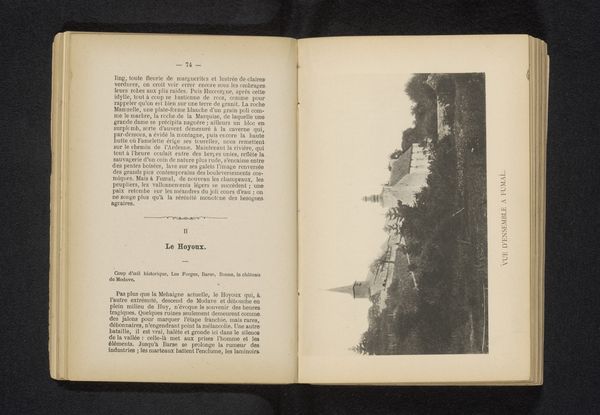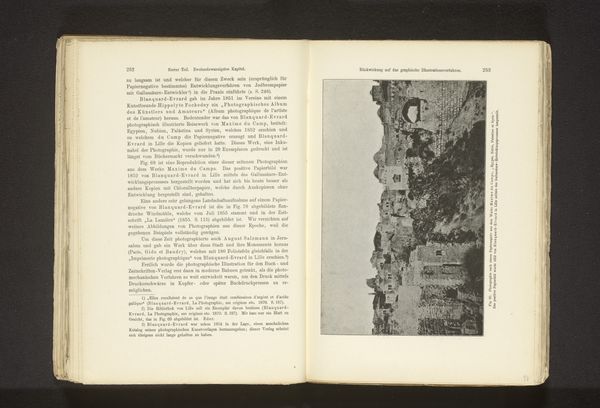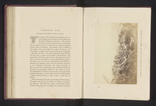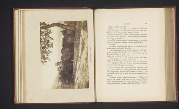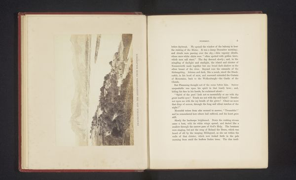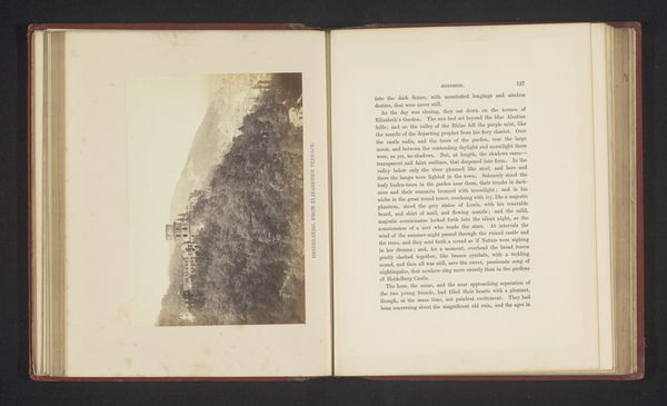 Curator: Let's take a closer look at this fascinating albumen print entitled "Gezicht op het klooster la Certosa, nabij Florence" by Giacomo Brogi, dating from before 1863. It's mounted in a book, next to an excerpt from George Eliot’s novel Romola. What are your first thoughts? Editor: Well, immediately, it feels a bit forlorn. The strong contrast between the vegetation above the Charterhouse, and the hard-packed land down the hill makes me question who laboured and built such strong diagonal pathways from the ground up. The severe vertical architecture adds to that somber atmosphere. I notice its scale in relationship to the figures within George Eliot’s passage; did Giacomo intend the readers to feel as small, or connected to such vast institutionalised infrastructure? Curator: Absolutely. The composition really guides the eye upwards along that sloping path to the monastery, which Brogi, I believe, hoped to capture the spiritual ascension, or, the literal process to the afterlife! Editor: Indeed, though for me the appeal rests more in how Brogi employs a technology so utterly modern – early photography, this albumen print – to freeze an idea, or architectural vision from another era! The sharp textures and details provided would've highlighted his ability and technical capabilities; how novel a trade to be capable of, while replicating scenes within well-sought after literature. Curator: A keen point, considering how photography at that time was quickly replacing traditional printmaking! And I find it curious that such careful craftsmanship can also evoke such a raw, almost haunted, atmosphere, as well. Editor: Yes! Perhaps that rawness is tied to the economic system of photography during the late 19th century. Looking at his career, he produced landscape and architectural views to profit from growing European tourist circuits: that gives an idea of the monetary labour going on here that speaks differently from a “simple” pretty Italian landscape. Curator: It certainly makes you wonder about all those unnamed laborers involved in its production and circulation. This little picture holds a lot, doesn't it? Editor: More than initially meets the eye! That's for sure.