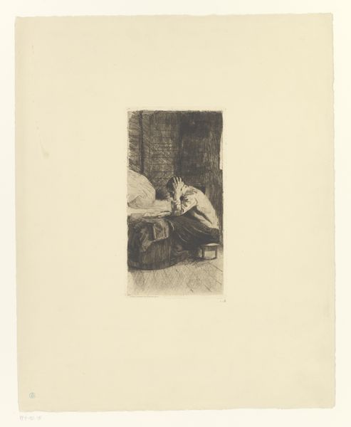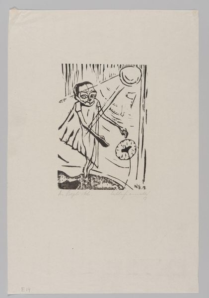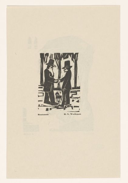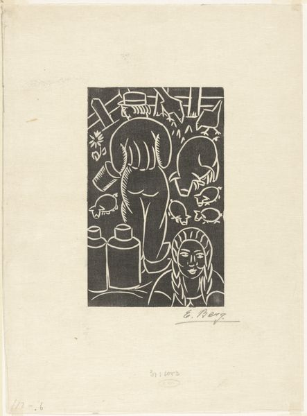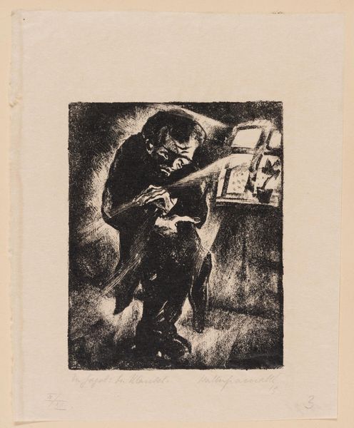Jean Emile Laboureur made this print of the collector Alphonse Lotz-Brissonneau, using wood engraving techniques. This was a popular medium in the early 20th century, particularly among artists interested in accessible art. We can see a man examining a print, surrounded by shelves and boxes filled with artworks, suggesting the subject's profession as an art collector. Made in France, this print provides insight into the culture of art collecting and connoisseurship that was emerging at the time. Laboureur’s style is influenced by cubism but is also reminiscent of the Arts and Crafts Movement, seen in the geometric border, reflecting a desire to integrate art into everyday life. This piece not only portrays an individual, but it also speaks to the networks of art production, patronage and artistic taste in interwar France. To understand the social and institutional context of the work, it is worth exploring exhibition catalogues, biographies of collectors, and critical reviews in art journals from this period.