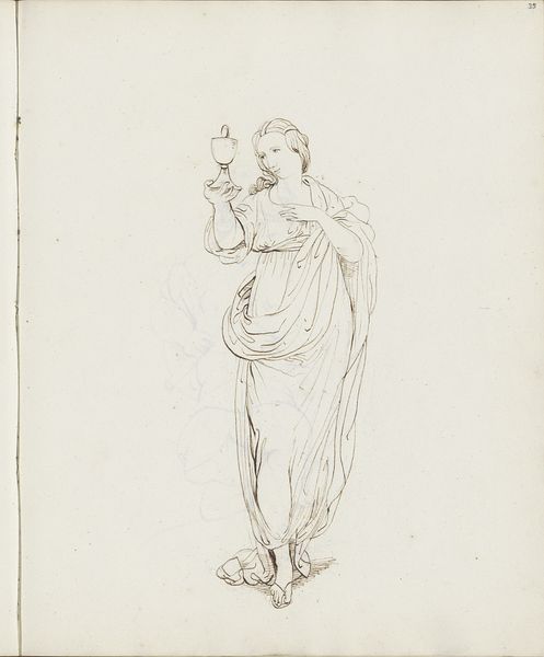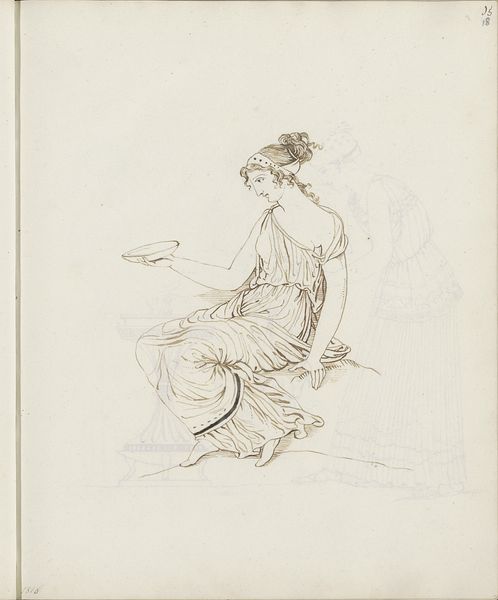 Curator: Looking at "Seated Woman in a Mourning Attitude," a pencil drawing from 1821 by jonkvrouw Elisabeth Kemper, what strikes you most? Editor: An overwhelming feeling of lassitude. Her very posture speaks of weariness; it’s as if her own weight is too much to bear. The way her head rests on her hand—a classical gesture, certainly—but here it feels raw, unvarnished. Curator: Absolutely, and Kemper manages to convey this with such economical means. There's a Neoclassical air to the flowing drapery and the sitter's idealized features, echoing earlier artistic conventions. But then you notice the sketch-like quality, a sense of immediacy, that cuts through any idealization. The slight asymmetry, the unfinished areas—it suggests something much more intimate and personal. Editor: You know, those 'imperfections,' if you can even call them that, are where the power lies. It transforms her from a distant goddess to a woman caught in a moment of intense emotion. The chair, a symbol of authority and stability, becomes a mere prop, unable to offer solace. I’m immediately thinking about themes of mourning and personal grief—or the cultural symbols attached to suffering. Curator: It’s interesting how you latch onto those signs because, personally, it evokes a sense of the artist exploring an idea, not necessarily a definitive representation. Maybe it’s the inherent nature of a sketch that gives the drawing an ethereal quality. It exists between a thought and a fully formed piece. Editor: Perhaps, but even an initial thought can hold immense symbolic weight. Consider how the downcast eyes, a universal signifier of sorrow, connect us across time. And think about how the pose—hand supporting head—has been used for centuries to represent melancholy. Kemper taps into a deep well of cultural memory, intentional or not. Curator: A fascinating point. It highlights how even what we perceive as spontaneous and heartfelt expressions often have roots in visual traditions. Even while the artist might have been striving to capture something ephemeral, something in the here-and-now. Editor: And that tension—between personal experience and inherited visual language—is precisely what makes this sketch so compelling, isn’t it? Curator: Precisely!