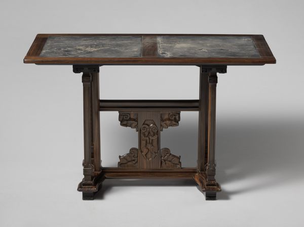 Curator: This ornate table, created by Jan van Mekeren around 1695 to 1710, offers an intriguing look into the stylistic tastes of the late 17th and early 18th centuries. Editor: It’s rather somber, isn't it? The dark wood dominates, yet there's an attempt to alleviate the austerity through the floral inlays. I find myself drawn to its quiet formality. Curator: Indeed. Notice how the artisan uses the wood's inherent grain and color as key elements of the overall design. The dark panels are juxtaposed against lighter edges and floral detailing, creating contrast and rhythm. Editor: The floral imagery seems directly tied to themes of growth, prosperity, and the bounty of nature that were frequently used in Dutch art. The inclusion of the flowers almost feels talismanic, evoking ideas of health and well-being for the home it occupied. Curator: Exactly, the arrangement and style of the inlays indicate an emphasis on craftsmanship. Look closely and you will see the level of precision and care, indicating considerable skill. The design suggests both formality and a conscious organization of surface planes. Editor: Considering the period, the darkness and the density of the applied floral motif may speak to cultural anxieties, or the ephemeral nature of life's joys in a world shadowed by uncertainty and plague. Curator: An interesting perspective. Whether that darkness reflects anxieties, the careful balance of light and shadow is a clever aspect of this piece's visual construction. Editor: By recognizing how Van Mekeren incorporated symbolic weight and detail into a functional object, we can glimpse aspects of their belief system and broader culture. Curator: Ultimately, examining elements such as its careful structure enables a much better understanding of this artist and this historical moment. Editor: Agreed. This dialogue reminds us how household objects can tell us such rich histories if we stop and consider how it speaks, not only materially but symbolically.