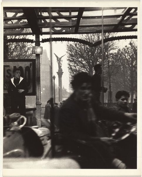 Curator: This photograph, "Woman with flowers on street, Paris", was captured by Robert Frank in 1951. Editor: It’s a stark, grayscale image. The woman’s expression…weary almost. The muted tones give a real sense of grit and daily life. Curator: Frank was a master of capturing social realities. Post-war Paris was recovering, facing economic hardship and social change. His photography really brought the social periphery into focus. Editor: Yes. You see her flowers – maybe a symbolic offering of beauty amid that hardship? In many cultures, flowers are seen as transient symbols of hope and rebirth. She is literally sitting on the sidewalk corner. It conveys a sense of resilience and perhaps desperation. Curator: Considering the political landscape, this image goes against the popular notion of France as some flourishing democracy with its victory over Nazi Germany just a few years before. Robert Frank captured ordinary moments and by doing that, exposed the social and political fabric of the time. The flowers would bring her income and a reminder of beauty to those on their journey to and from the war ravaged city. Editor: Look closer; notice the lines scribbled on the wood panel beside her. Do you read them like Parisian prices and promotions in hopes for her sales of those blossoms to the city’s wandering population? Curator: Most likely yes. A very common visual cue in these Parisian sceneries that speaks to class divide during the post-war-period. This really does provide insight on France, far removed from popular understanding. Editor: It makes you think about what persists… what blooms and thrives even when surroundings look bleak. Curator: The very function of Art and aesthetics—this photograph helps carry that on and preserves cultural memory. Editor: Exactly. Images as time capsules—vessels of human experiences we continue to engage with across generations.