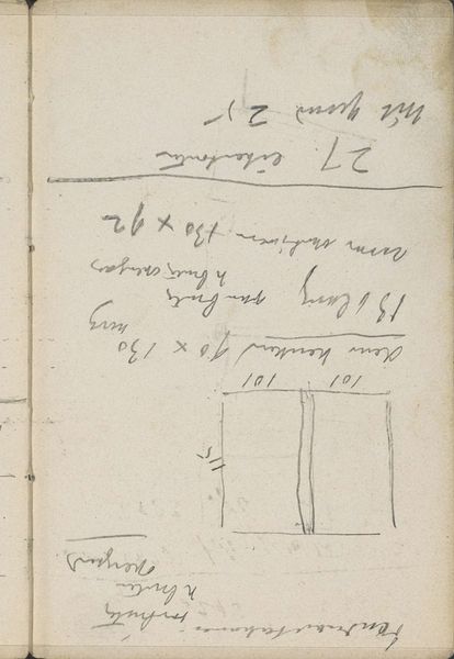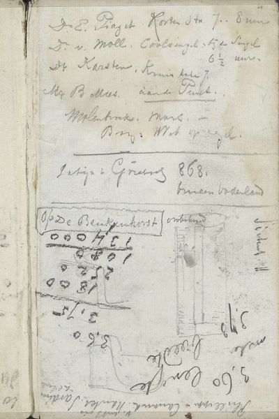 Curator: Welcome. We’re looking at Cornelis Vreedenburgh’s "Notities," created sometime between 1890 and 1946. It's a mixed-media drawing with pencil on paper, currently held in the Rijksmuseum collection. Editor: It appears to be a page torn from a sketchbook, filled with what looks like handwritten notes and calculations, perhaps architectural in nature? What immediately strikes me is its fragmentary, almost chaotic composition. What catches your eye, viewing it from a formalist perspective? Curator: Indeed. What intrigues me most is the interplay between the disparate textual elements. Observe how the various scripts—some cursive, others more technical—create a dynamic surface. Notice also the contrasting weights of the lines, shifting from delicate, almost ephemeral marks to darker, more assertive strokes. Consider how the placement of each inscription relates to the other – do they create a harmonious composition? Editor: I see what you mean. The variation definitely creates visual interest, preventing it from feeling like just a collection of notes. It's like the artist is creating a landscape of text. Is the medium of the paper significant? Curator: The paper acts as both a ground and an active element. Its texture interacts with the pencil marks, influencing their appearance. One can read this paper surface as a 'field' on which the artist inscribes signs, disrupting any pre-conceived unity and revealing the inherent structure and potential of both word and medium. Consider its function as a structural element. How does the artist manipulate these formal components to establish relationships and create an autonomous aesthetic experience? Editor: So, beyond any practical function, it becomes about the visual rhythm and textures created by the words themselves. Thank you, that’s really given me a new perspective. Curator: It’s through careful observation and deconstruction of elements like line, texture, and form that we can begin to understand the aesthetic potential within seemingly ordinary documents like this sketchbook page.