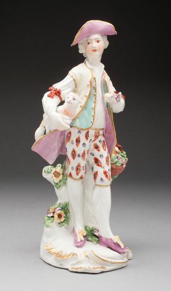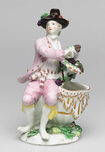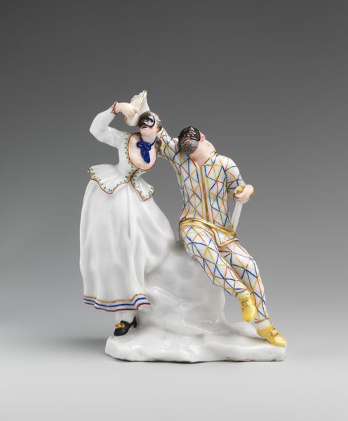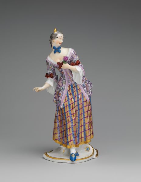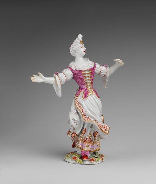 Curator: Immediately striking! The stark white punctuated by delicate flourishes gives this "Dancer," made by the Höchst Manufactory sometime between 1753 and 1763, a uniquely arresting quality. Editor: It's quite delightful. The dynamism captured in the figure is remarkable given that it's crafted from porcelain, a relatively brittle material. The artist really captures a sense of lightness. Curator: Höchst was one of the first porcelain factories in Germany. This dancer, part of a pair, speaks to the period's fascination with courtly entertainments and the status of owning such refined, delicate objects. It projects aristocratic leisure and cultivation. Editor: I'm captivated by the compositional choices, actually. Note how the upward gaze and outreached arms lead the eye up, reinforcing the feeling of buoyancy. Then the ruffled edges of the garment add incredible textural contrast to the smoothness of the porcelain skin. Curator: Right. The choice of porcelain was far from arbitrary. Porcelain production was linked with national prestige; each ruling house wanted to produce it in quantity and quality that equaled or bettered all others. These figurines ended up as coveted diplomatic gifts or signs of elevated status. Editor: Looking at the base, there's this sort of rococo swirl, not really integrated with the figure's motion, but definitely creating visual interest. Do you think it was added for purely aesthetic reasons or did it also lend stability? Curator: Good question! A bit of both, probably. Ornament was rarely separated from functionality at the time. The swirl grounds him, literally and metaphorically, as an object to be owned and displayed—further cementing the political power associated with these things. The swirl itself is very stylish and very contemporary! Editor: Agreed. Well, regardless of its history and significance, the figurine displays considerable technical virtuosity and understanding of form, creating visual excitement even now. Curator: Indeed, and seeing such items in collections like the Met serves as an ongoing reminder of the complex historical contexts from which "art" emerges and how value itself shifts over time.