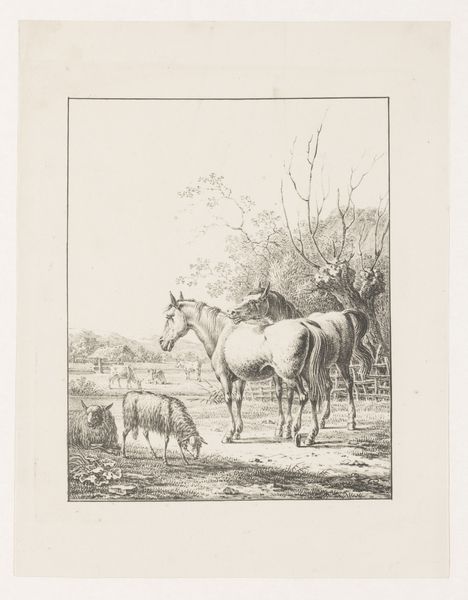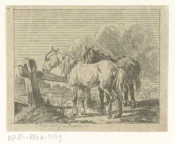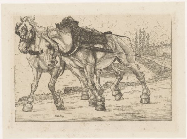 Curator: Here we have "Two Horses in a River Landscape," an etching and engraving created in 1809 by Adam von Bartsch, a significant figure in printmaking history. Editor: My initial impression is one of quietude. The somber monochrome palette contributes to a certain contemplative stillness. Notice the meticulous hatching creating gradations of tone and depth. Curator: Absolutely. The strategic placement of these two equine figures is worth noting. The artist’s play with light and shadow adds dimension, emphasizing the structural forms beneath. It is, after all, a masterful display of value relationships. Editor: Yet those very horses are potent symbols! Consider the horse throughout history, representing power, freedom, nobility...their placement near the river adds another layer. Water symbolizes purification and the passage of time, invoking ideas of temporality. Curator: While the symbolic potential of the imagery cannot be discounted, the pure formalism here is key. Observe the relationship between the textured foreground and the simplified background. Von Bartsch balances detail with areas of negative space. Editor: But even in realism, artists choose their subjects and arrangements with purpose! Aren't these horses also representations of status in 19th century river society? Consider their immaculate saddles, revealing prosperity, their health indicative of care and social standing. Curator: Undeniably. Yet through compositional means and the use of line and form, Von Bartsch provides visual interest, directing the viewer’s attention through varying levels of tonal intensity. Editor: And the viewer is invited to contemplate more than just forms! These animals and their surroundings serve as conduits for societal stories. They embody narratives of labour, travel and ownership woven within that landscape. Curator: A rich demonstration, then, of formal construction meeting cultural encoding in visual format. Thank you for that compelling reading. Editor: An enriching convergence of visual strategy and symbol recognition has opened fresh channels for analysis, so I thank you too!