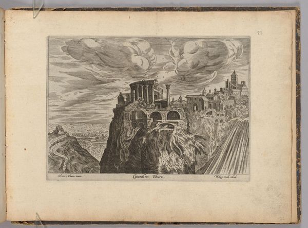 Editor: This is Hendrick van Cleve III's "Portus Pontis nigri," a fascinating plate. The contrast between the detailed foreground and the distant city is striking. What do you make of its composition? Curator: Indeed. Observe how the artist utilizes linear perspective, drawing the eye towards the vanishing point on the horizon. The interplay of light and shadow defines form and space, creating depth within the two-dimensional plane. Do you notice how the architectural elements in the foreground function as framing devices? Editor: Yes, now that you mention it, they seem to direct our gaze. The lines really pull you into the scene. Curator: Precisely. Furthermore, note the meticulous rendering of textures, from the smooth surfaces of the classical structures to the rougher textures of the landscape. The artist’s command of line and form is quite evident. Editor: I never would have noticed all of that on my own. It really highlights how much the artist is playing with perspective. Curator: I'm glad I could illuminate the methods on display.
