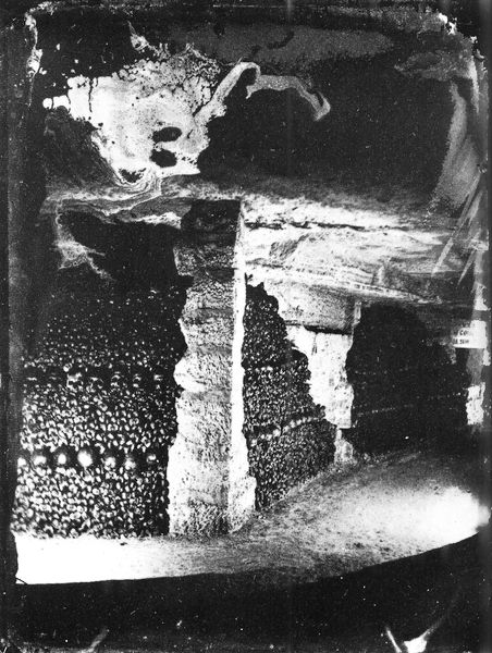 Curator: Oh my, well that's bleak. It looks like a wall made entirely of skulls. It makes me feel uneasy, a primal sense of mortality. I can smell the dust just looking at it. Editor: What you are experiencing is precisely what Félix Nadar, using the gelatin-silver print medium in 1861, wanted you to feel. This is "Catacombes De Paris". Its aesthetic and structural elements serve to produce a powerful statement about existence, or the cessation thereof. Curator: So, a fashionable memento mori from Parisian high society? Very rock 'n' roll for its time, I suppose. But what's with that ghostly lighting at the bottom? Did he set up some early flash apparatus for this? Editor: Nadar was indeed a pioneer. Illumination in such dark, subterranean spaces required innovation. His success was critical. He deliberately positioned and metered light to sculpt the depth and contours of the osseous composition, thereby highlighting its themes of decay and transience. The interplay of light and shadow creates stark contrast. Curator: Absolutely, it adds this unsettling visual tension. Those strategically placed skulls forming a cross give a really theatrical flair to the whole macabre tableau. Editor: That structural gesture speaks to the reconciliation of faith with physical decomposition, prevalent themes in the Romanticism movement, yet rendered with stark realism that foreshadows later documentary photography. This is not simply recording death; it's composing with it, almost like a twisted still life. Curator: You're right. I’m beginning to appreciate that despite its gruesome subject matter, there's an artistry and almost beauty. And even now the high contrast remains incredibly affecting and it echoes those larger concerns from back then regarding history. Editor: The print serves as an eerie document, forcing the viewer to confront, and reflect upon the great universal truths about mortality and its connection with history. Its enduring power lies in its capacity to trigger not only dread, but equally an introspective contemplation regarding our fleeting time on this planet.