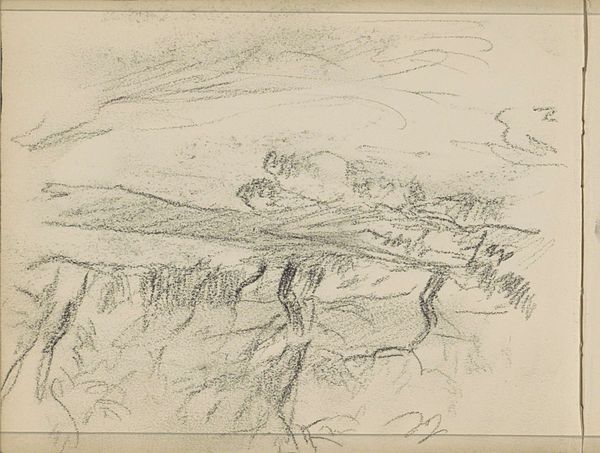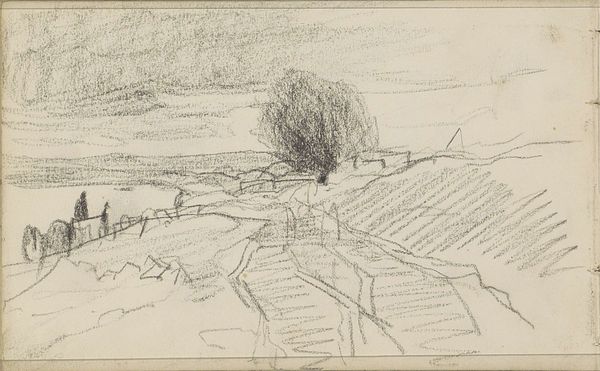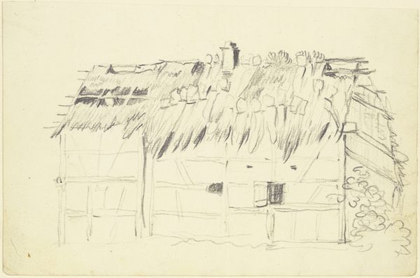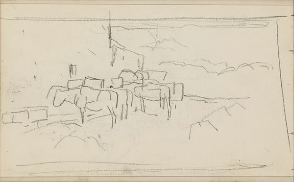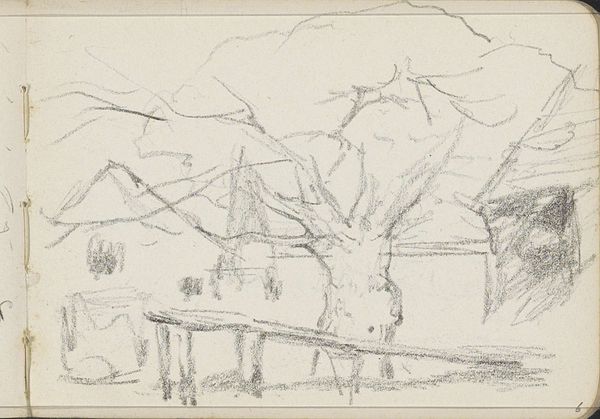 Editor: This is "Erf met een waterrad," or "Yard with a Water Wheel," a pencil drawing created sometime between 1865 and 1913. It's a landscape view, fairly loose and sketched. The wheel dominates, but its structural placement is somewhat confusing to me. What symbols jump out to you? Curator: The water wheel, instantly. Consider how its symbolism ripples outwards. In this era, such wheels spoke of human ingenuity harnessed to nature's power, of industry shaping the landscape. Water is both life-giving and, here, a source of mechanical energy. Think of the etymology, for example, in terms like "wellsprings." Does the drawing's incomplete nature alter this reading for you? Editor: Good point. That incompleteness gives it more of an everyday feel, not grand industry. It feels like the artist simply stopped to sketch what was around. Curator: Exactly. And this very "stopping" also carries symbolic weight. The unfinished image offers us not a fixed statement, but an invitation, reflecting a specific moment and implying time's relentless march. The image isn’t necessarily static—are we perhaps witnessing the imminent abandonment of older technologies? How does that idea sit with you? Editor: That's interesting, the idea of implied abandonment, like looking at something in transition. I appreciate how you linked the specific imagery to broader themes of time and memory. I hadn’t considered that! Curator: Remember, every mark, every absence, holds the potential for interpretation. Looking closely allows us to decode cultural values embedded in these artistic choices. Editor: I will certainly keep that in mind moving forward!