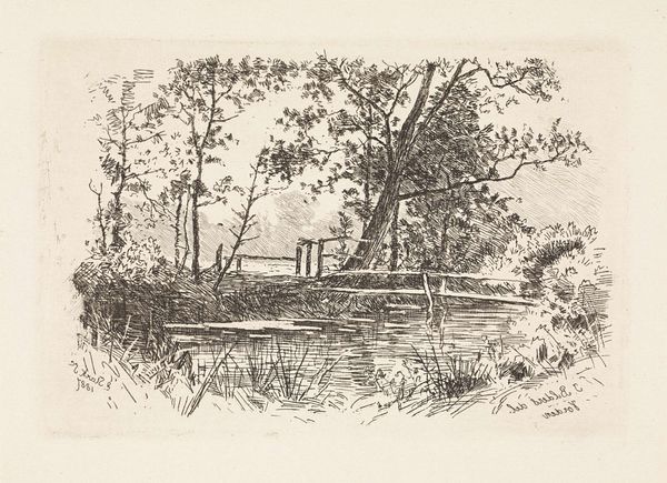 Curator: The linear quality is really striking here. Notice how Alexander Mollinger uses line weight and density to describe light and shadow. Editor: Yes, it feels remarkably still, doesn't it? Almost hushed. But who was experiencing that quiet, and in what way, becomes the crucial question, especially for depictions of the natural world like this “River Landscape near Maarseveen”, placing us somewhere between 1846 and 1867. Curator: He definitely emphasizes structure with those parallel pen strokes. It’s particularly noticeable in the rendering of the trees; their forms defined by the rhythm of lines. What does it tell us about how Mollinger perceived or wanted to present the landscape itself? Editor: Well, think about the Netherlands during this period: a rapidly changing socio-economic environment. Landscape paintings provided a visual means of connecting with a mythologized vision of national identity rooted in an agricultural past and a deeply ambivalent response to processes of urbanization, commodification, industrialization, and land exploitation. These bucolic settings were already becoming places of recreation rather than labor, representing an idealized national history for those with the leisure to pursue such sentimentality. Curator: I understand your point but even beyond these historical and cultural implications, there is a certain timelessness to Mollinger’s line work. The formal qualities contribute to its quiet, persistent mood and enduring appeal. The use of light, as I mentioned previously, emphasizes line to evoke the serenity of the landscape, that you have mentioned before, regardless of any background of this period. The sky and water read similarly too. Editor: Yes, and it’s within that tension—between the formal mastery and the societal anxieties mirrored by this art—that this work generates such nuanced meanings, revealing both artistry and deeper social context. Curator: True. It certainly asks us to reflect both on the power of skillful drawing and on what we bring to the landscape as viewers, across time. Editor: Indeed, viewing "River Landscape near Maarseveen" has given me food for thought regarding the intricate layers of meaning inherent within supposedly 'simple' landscapes. It emphasizes, above all, how critical it is for us to continue interrogating art in its historical context, allowing a more thorough comprehension.