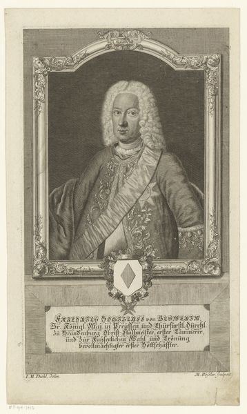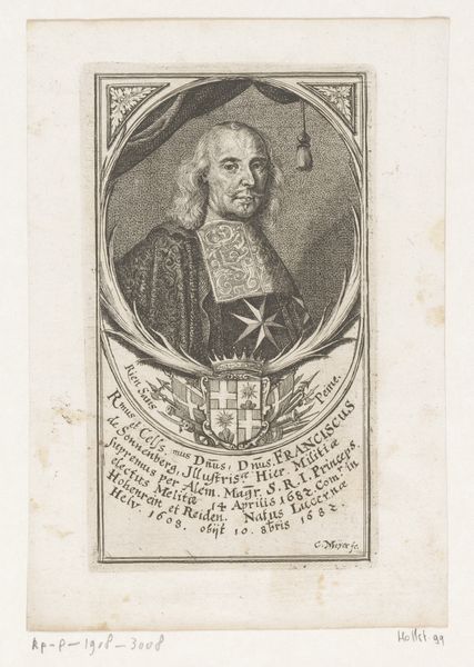 This is Carlo Gregori’s portrait of Cardinal Joaquín Fernández de Portocarrero, rendered in printmaking around the mid-18th century. Encased within an oval frame, the cardinal is depicted with soft, gradated lines, creating a delicate tonal range. The composition is structured by a series of contrasting shapes. The geometric precision of the Maltese cross on the cardinal’s robe sharply contrasts with the fluid, organic lines of his wig. The heraldic shields in the upper corners add further layers of symbolic meaning, framing the cardinal as a figure of both spiritual and temporal authority. The very materiality of the print invites contemplation on the nature of representation and the dissemination of power. The formal qualities of the artwork, therefore, function as a mirror, reflecting the complex interplay between identity, authority, and representation in the 18th century.