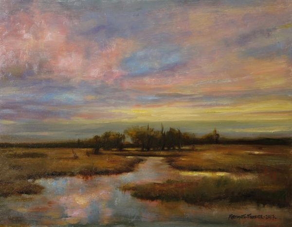 Editor: This is Rose Freymuth-Frazier's "Quiet Evening," painted in 2021, with acrylic paint, I believe. It's incredibly evocative—the colors, the sky, the feeling of stillness. How do you interpret this work, particularly in terms of its historical context? Curator: I'm immediately drawn to how this piece resonates with historical landscape painting, especially Impressionism, but pushes further. Think about the legacy of plein-air painting. What does it mean for a contemporary artist to engage in that tradition, especially in our era marked by climate anxiety and ecological awareness? Does this quiet evening suggest complacency, or does it invite a deeper, more critical look at our relationship with nature? Editor: That’s a really interesting point! I hadn’t considered the environmental implications. I was more focused on the aesthetic beauty. Curator: Exactly! The aesthetic can't be separated from its context. What is "beauty" when the landscapes we depict are under threat? Consider the socio-political implications. The ‘quiet evening’ may serve as a potent reminder of what we stand to lose if we fail to address environmental injustice and climate change. Does the impasto technique evoke a sense of urgency, almost a textural plea for attention? Editor: I see what you mean. The thickness of the paint adds a certain weight to the scene, a physicality that feels almost… mournful? Curator: Mournful, perhaps. Or perhaps hopeful that such evenings can continue. Freymuth-Frazier's contemporary lens makes us think about these traditions in light of gender, class, and access to these kinds of idyllic scenes. Who has the luxury to experience such ‘quiet evenings,’ and whose stories are often missing from these representations of nature? Editor: This has completely shifted how I see the painting! It's no longer just a pretty landscape, but a statement. Curator: Indeed. And it reminds us that art is never created in a vacuum. "Quiet Evening" is both beautiful and provocative, urging us to consider its place within a complex web of history, politics, and environmental concerns.