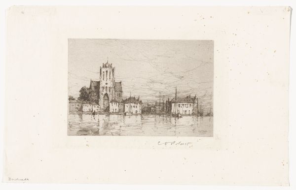 Curator: Here we have "Gezicht op de Nieuwe Haven in Dordrecht," or "View of the New Harbor in Dordrecht," an etching by Willem Witsen, created around 1899-1900. It’s currently held here at the Rijksmuseum. Editor: It's quite striking. There's a stillness, almost a solemnity to the scene despite it depicting a bustling harbor. The muted tones emphasize the water and the way it reflects the city’s architecture. Curator: Witsen was deeply embedded in the art circles of his time, particularly the Amsterdam Impressionists. This work reflects a fascination with capturing atmospheric effects, much like his contemporaries. He also came from a position of wealth, with connections that helped him gain exposure in prestigious venues, playing an active role in promoting art. Editor: Yes, the etching technique is masterful. The use of line and shadow gives the buildings, especially the church tower, a sense of age and permanence. The tower looming over the scene almost evokes a feeling of spiritual watchfulness over the city, a symbol of endurance, reflecting the cultural memory embedded within the city’s visual identity. Curator: Dordrecht has always been a strategically and economically important city in the Netherlands, playing a role in major historical moments and Witsen’s decision to portray it isn’t accidental. Such scenes cemented ideas of Dutch identity, offering reassuring imagery to a nation grappling with modernization and shifting social structures. Editor: And the water, constantly in flux, mirrors the changing nature of time and history, a reflective surface showing a slightly distorted but nonetheless present reality. I read the composition also as speaking to Dordrecht as a site of transition and connectivity through the maritime activities. Curator: Precisely. Witsen’s composition frames the city from across the water, and this emphasizes its role as a trade hub, connecting Dordrecht to wider economic networks. Editor: I find that the beauty in such art pieces stems from the quiet contemplation it invites. It reveals how much depth is contained within seemingly simple representations of our surroundings. Curator: Indeed. And exploring it highlights art's enduring relevance, particularly in interpreting the forces that shape our environment, our history, and our identity.
