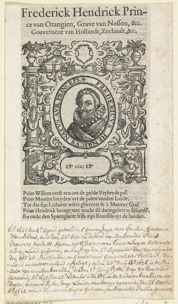 Editor: This engraving from 1598 by Jost Amman, titled "Portret van Chlodio, koning der Franken," depicts a regal figure within an ornate border, along with what looks like a battle scene at the bottom. The detail is remarkable, especially considering its small size. How should we interpret its depiction of power and leadership, situated within the historical context? Curator: Well, this image wasn't just a simple portrait; it functioned within a visual and political landscape. How do you think Amman's decision to include text *around* the image of Clodio shapes our understanding of it? It makes it a printed portrait, thus much easier to disseminate widely. Editor: It feels like the text elevates the image, lending authority through historical context. But is the intention to just document the king, or to make some larger commentary on power at the time of its creation, late 16th century? Curator: Precisely! Jost Amman operated in a time of religious and political upheaval. Consider the target audience for these prints: literate, politically aware citizens. The visual imagery and historical narratives played a vital role in shaping public opinion and justifying social order. Editor: So the battle scene at the bottom - is that tied to Clodio specifically or something else? Curator: Possibly referencing Clodio's military achievements and associating those with strength and legitimacy, reinforcing his image as a ruler of strength. But consider this as well; what socio-political ideas are made evident in this portrayal? Perhaps something related to 16th-century perspectives on leadership versus actual historical fact. Editor: It seems like it functions as propaganda or nation building, attempting to cement a certain idea of kingship for its intended audience. Curator: Absolutely. This image provides a valuable glimpse into the interplay between art, power, and the construction of historical narratives during a transformative period in European history. Thank you for offering that key reading. Editor: My pleasure. I definitely understand the interplay between the creation of historical narrative and how cultural forces affect these types of illustrations now.