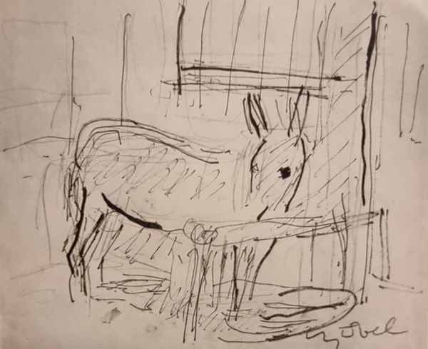 Curator: This is "Cavallo di Forma" by Marino Marini, part of the collection at the Harvard Art Museums. Editor: It feels almost ghostly, doesn't it? Like a horse emerging from fog. The texture is quite striking. Curator: Marini was fascinated by the relationship between humans and horses, particularly the sense of tension and balance. You can see it in the deliberate, almost rough handling of the materials. Editor: I'm drawn to the marks themselves. The process seems so present. It looks like charcoal or a similar medium, worked and reworked to build up the form. It feels incredibly direct, almost primal. Curator: Indeed. Marini explored these themes throughout his career, capturing the shifting dynamics of modernity, the unease and uncertainty, in this ancient pairing of man and beast. Editor: The starkness definitely stays with you. It reminds me that art isn't just about the image; it's about the hands that made it.