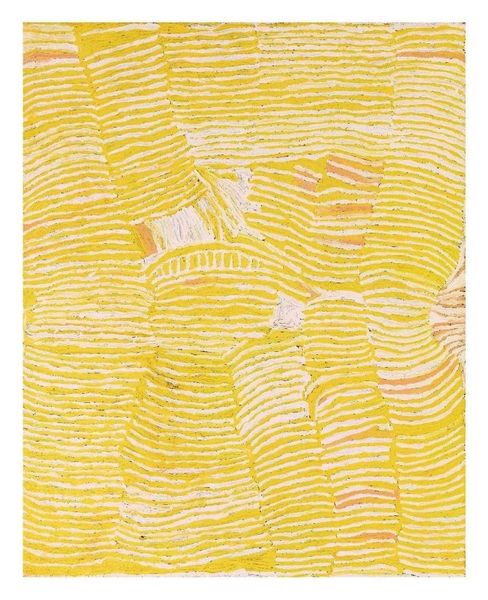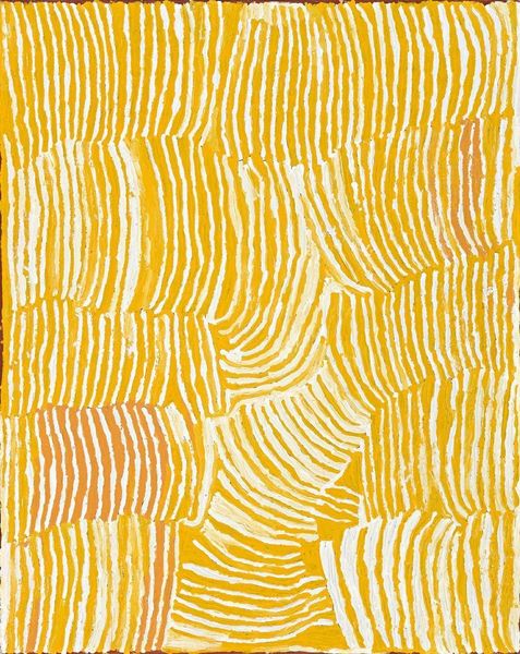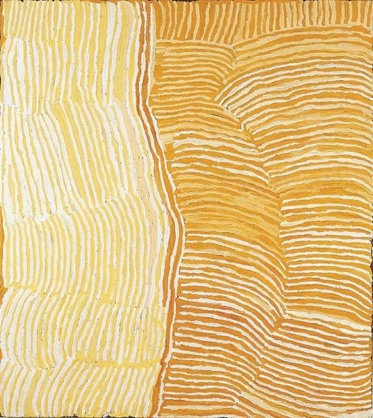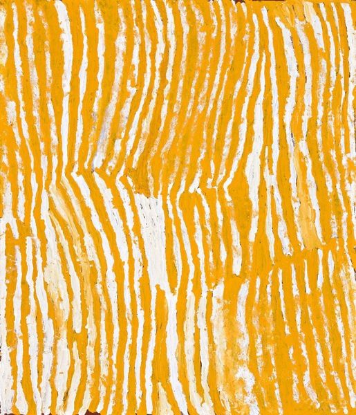 Editor: Here we have "Lupulnga," an acrylic painting created by Makinti Napanangka in 2003. The overall effect is mesmerizing. The yellow and white lines create a strong visual pattern. What’s your take on this piece? Curator: What I see first is the continuation of Indigenous Australian artists engaging with the art world on their own terms. The painting may appear abstract, but it speaks to a deep cultural connection to land and Dreaming stories, even if those specific narratives aren't explicitly shared with a broader audience. Editor: So, you see its abstraction as part of a bigger cultural picture? Curator: Exactly. It raises questions about the art market, doesn't it? Who decides what is considered ‘art’ and how it’s valued? Are we appreciating this solely for its aesthetic qualities, or are we acknowledging the complex cultural context it comes from? How has the market impacted what art is being produced? Editor: That's fascinating. It makes me think about the power dynamics involved in representing other cultures. Curator: Precisely. Museums and galleries play a huge role here, and it's important to be aware of their role in either amplifying or diluting Indigenous voices. Should museums change and reflect these considerations in exhibits? Editor: Absolutely! I didn't initially think about the political aspects, but now I see that the work prompts crucial discussions about representation and cultural exchange. Curator: Indeed, viewing art this way provides a fuller appreciation, and also encourages us to be more conscientious. Editor: I'll definitely be more attentive to these issues in my own research! Thanks.
