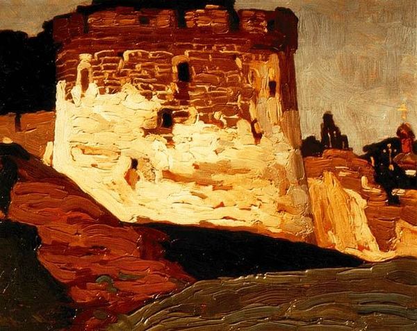 Editor: We’re looking at “Walls of Kremlin in Novgorod” by Nicholas Roerich, an oil painting from 1903. It’s dominated by earth tones and the looming structure of the fortress itself. There's a stark, almost melancholic feel. What strikes you about this piece? Curator: The Kremlin here is more than just architecture; it's a symbol imbued with Russian history and power, particularly in the early 20th century. This work reminds us that art is a powerful tool that often evokes a sense of national identity, but how is this image perceived beyond Russia's borders? Editor: That's a good question. Maybe a symbol of oppression to some? The way it looms definitely contributes to that feeling. It’s very imposing. Curator: Precisely. The painting's aesthetic choices--the simplified forms and earthy color palette--tie into a broader artistic trend, a search for national roots within the Russian avant-garde. Think about how the state sanctioned certain imagery. Were these artistic expressions controlled? Editor: I can imagine there were definitely boundaries. So even in its 'simplicity,' the artwork becomes a loaded visual statement within that political context? Curator: Exactly! Art rarely exists in a vacuum. This Kremlin isn't just stone and mortar; it is tied to power, identity, and control. Knowing the history allows us to see that tension, right? Editor: Definitely. I’m seeing this work with totally fresh eyes! Curator: That's the magic of understanding art as a product of its time. I think now, looking at this painting, its layers of cultural meaning stand out more. Editor: Absolutely. Thanks, that’s really opened it up for me.