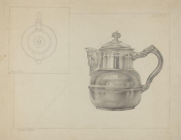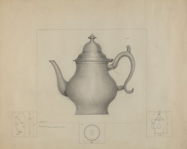Janet Riza rendered this Pewter Teapot as a pencil drawing sometime in the late 20th century. The drawing is concerned with the function and design of everyday objects. This piece seems to suggest a renewed interest in craft, industry and design. The drawing includes several technical elements such as side views and measurements which gives insight into how design drawings developed historically. In particular, the Bauhaus school developed a new symbiosis between art and industry. It taught design principles alongside craft skills and it put forward a new approach to art education. It saw no separation between fine art and applied art. To understand this drawing fully, we might look at examples from design schools and art schools and also trade publications. By looking at historical and institutional contexts we can start to trace how ideas circulate and shape artistic practice.