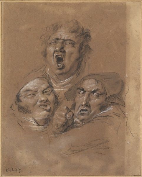 Curator: Look at this striking sheet, "Two Studies for a Grotesque Head." It was created sometime in the 16th or 17th century by an anonymous artist. Immediately, the raw emotional intensity is what strikes me. Editor: Yes, the stark use of charcoal really brings forth an immediate sense of unrest. What draws my attention first is the materiality – the texture of the paper and the rough application of the charcoal give the work a palpable, almost visceral quality. Curator: Absolutely. The drawing, currently held here at the Metropolitan Museum of Art, perfectly illustrates Mannerist art style through its exaggerated forms. Take for instance the grotesque imagery which offers visual freedom, driven by emotional and aesthetic intensity rather than realism. The artist freely manipulates the features. Editor: How fascinating. Consider also how charcoal, being easily smudged, allows for the rapid capture of fleeting emotions, the material properties impacting how an image conveys instability and the transitory nature of affect itself. Were similar studies mass-produced, sold as novelties for consumption? I find that consideration as telling as its formal aspects. Curator: I appreciate your perspective. I imagine the image might have been used within academic art circles. After all, in its artful handling of dark and light, you discern clear technical skill that must have impressed contemporary viewers. The dramatic faces were undoubtedly studies meant to capture exaggerated emotion for use in some large, epic scene of suffering or triumph. Editor: Perhaps the point of departure comes down to the reading. How does art affect our material surroundings, and how does material dictate artistic form? And does charcoal's easy access change access to the consumption or art? While I don't discard the stylistic and technical value of art, my attention draws more towards the environment of art production. Curator: That’s a valuable distinction. Even as we debate intent, the very intensity it conveys, that feeling continues to resonate through time. Editor: Indeed. I will reconsider this piece with new formal elements to keep in mind.