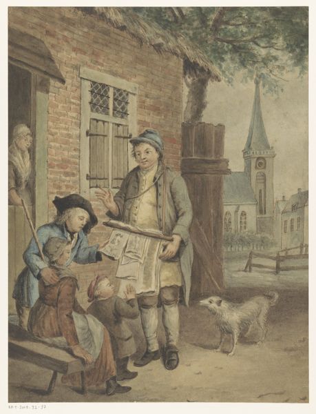 Christina Chalon made this watercolor drawing, “Grandfather Distributing Toys,” sometime in the late 18th century. The humble materials, paper and watercolor, give the scene a feeling of intimacy, as if we're peeking into a private moment. The careful application of watercolor paint, with its delicate washes and fine lines, speaks to Chalon’s skill. Consider the simple toys the grandfather is handing out, likely made of wood. In this period, toys were not mass-produced, but lovingly crafted, often by family members. These objects, infused with care, stand in contrast to our contemporary world of mass consumption, where toys are often disposable and impersonal. Looking closely, we can see that the scene is set against a modest brick building, surrounded by nature. Chalon’s attention to detail, from the brickwork to the carefully woven baskets, elevates the everyday. By focusing on these elements, Chalon reminds us of the value of simple pleasures and the beauty of handcrafted objects.