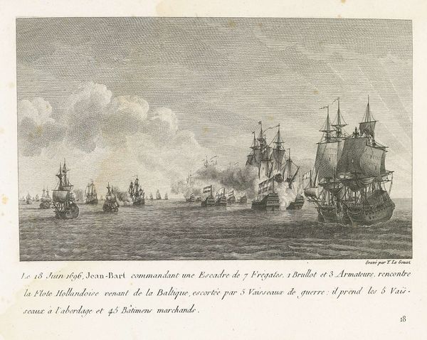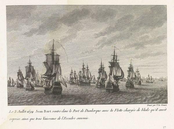 Yves Marie Le Gouaz made this engraving depicting Jan Bart herovert graanschepen op een Hollands eskader, 1694. Observe how the naval ships become floating fortresses, fiercely battling amidst churning waters and billowing smoke. Ships, since antiquity, have stood as potent symbols of nations, trade, and exploration, embodying the spirit of expansion and the clash of empires. The vessels here evoke images of the Ark, or even a Leviathan. The ship is an extension of the nation, with a sense of might and the terror of war. Smoke and clouds envelop the naval combat. The image is full of struggle and strife, mirroring the cyclical nature of conflicts in human history. In the collective psyche, maritime battles trigger primal associations with survival and the dominance of civilization. A potent emotional blend of excitement and dread, engaging viewers at a subconscious level.