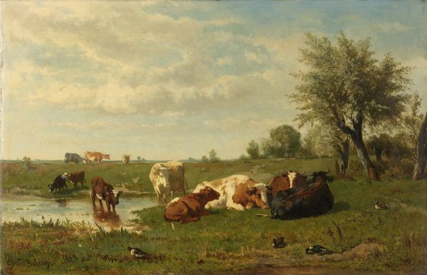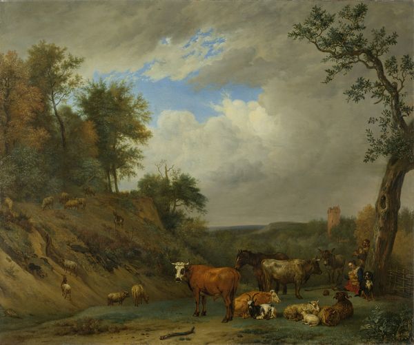 Curator: Here we have "Landscape with Cattle", a canvas rendered in oils by Jan Kobell the Younger in 1804. Art Historian: It evokes such tranquility. The muted light seems to soften every edge, blurring the lines between the land, sky, and water. Curator: Right. Kobell presents what seems a bucolic, calm rural life, part of the broader Romantic interest in nature as an escape. However, these portrayals often obscured the socio-economic realities of rural workers in the 19th century, romanticizing a labor-intensive lifestyle. Art Historian: That's a good point, but look at the cattle. They are almost totemic, archetypal forms, representing fertility and the pastoral ideal, common symbols in landscape art for centuries. They link us back to foundational mythologies about harmony with nature. Even the inclusion of figures at work, their postures and gestures remind us that labor can connect humans with nature. Curator: Indeed, these symbolic readings do exist in parallel. The placement of the working figures near the water, for example, makes them integral components within the landscape, blurring the lines of who and what truly occupies that landscape. This in turn is reflective of society’s understanding of work and working-class members, which sadly leads to the issue of erasing differences among social classes. Art Historian: Yes, there's a clear duality in how we're invited to interpret the painting. The soft palette and the hazy rendering suggest a dreamlike, harmonious existence. Curator: I see your point about the dreamlike quality. For some, the image is undoubtedly a source of solace. But we need to confront how often similar images also contributed to a whitewashed version of the past, overlooking exploitation and hard labour within unequal agrarian structures. Art Historian: Reflecting on it all, this artwork invites me into a serene state, a realm where cattle symbolize the wealth of simplicity, maybe a sort of subconscious return to our agrarian roots. Curator: Looking at it myself, it's a perfect visual prompt to question which stories and perspectives get emphasized, and to ask whose labour makes idealized landscapes possible.
