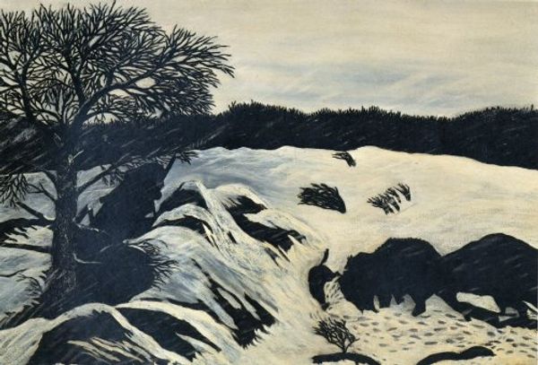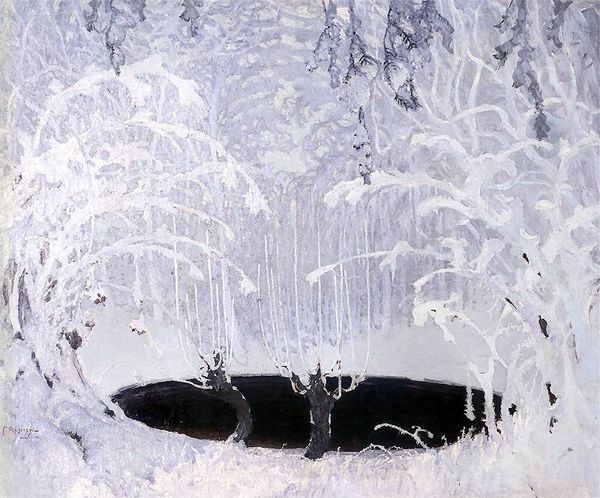 Editor: Theodor Kittelsen's charcoal and watercolor drawing, possibly titled "The Forest Court," captures this wonderfully ethereal winter scene. The snow-covered trees are so monumental; there's this lonely little hare standing at the edge of the woods. It feels incredibly symbolic...almost like a dream. What do you make of this piece? Curator: Oh, this drawing absolutely whispers stories, doesn’t it? It makes me think of winter evenings from my childhood, when the world seemed hushed and the snow transformed everything into these ghostly shapes. Kittelsen taps into something primal here. See how the moonlight, just a sliver up there, casts these monumental shadows. And yes, that solitary hare. A wanderer, perhaps, or a seeker of some hidden wisdom. Do you feel a bit of the forest looking back at you? Editor: I do, actually. There’s a sense of watchful presence. I love how he gives these huge, snowy shapes an almost animate quality. Is it me, or are they guarding something? Curator: Absolutely! They might be guarding their silence! These aren’t just trees covered in snow; they’re figures from a fairytale. Kittelsen often explored Norwegian folklore, the hidden realms just beyond our everyday perception. Perhaps the hare is about to stumble into just such a world. Does it feel welcoming or forbidding to you? Editor: Hmm… both, actually. It’s beautiful but definitely carries an undercurrent of something unknown, maybe even a little menacing? Curator: Precisely. Kittelsen's genius lies in capturing that duality, that Nordic sense of beauty intertwined with lurking danger. The romance, the threat, always coexisting. A truly delicious visual poem! Editor: This makes me appreciate the symbolism so much more. I was focused on the technique, but seeing it as a gateway to folklore really shifts my perspective. Curator: Art is a kind of magic, no? It reveals the extraordinary in the seemingly ordinary, the secrets hidden just beneath the snow. And just as we have unveiled something of its magic here together, so this magical, moonlit artwork reveals something of us in turn, a new vision of things forever.
