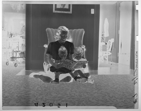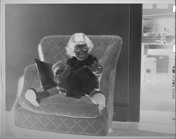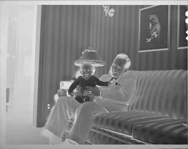 Curator: There’s something hauntingly beautiful about this untitled photograph by Martin Schweig, showing an old man with glasses posed holding a young baby on a couch. Editor: It feels intimate, almost melancholic. The high contrast amplifies the vulnerability in their faces, wouldn’t you say? Curator: Absolutely. It speaks to the peculiar relationship between generations and the odd social performance of family. He’s posed so formally, and yet his sneakers bring a touch of everyday life. Editor: The image is a meditation on time, isn't it? The lamp, the glasses, and the chair all point to a specific era, as does the Kodak safety film strip that produced it. Curator: Yes, exactly, it’s as though Schweig captures not just a moment, but a whole world shifting. Editor: It makes you wonder about their story, their connection. Curator: Indeed. It's a photograph that captures the quiet tension between tradition and the fleeting present. Editor: So true. It makes one contemplate how we all participate in constructing narratives through photographs.