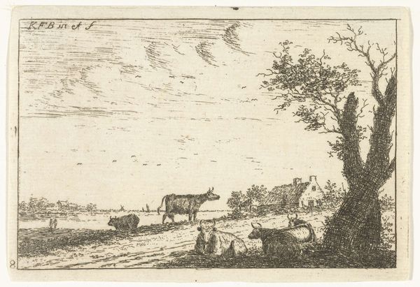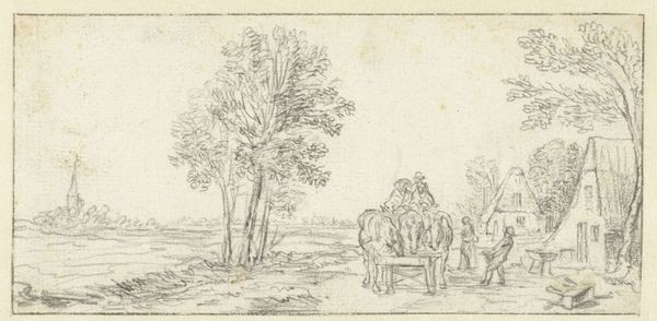 Hermanus Numan created "Juli," a drawing at an unknown date, now housed in the Rijksmuseum. The monochrome work presents a serene landscape with a rustic cart, figures, and distant buildings. The composition is structured around a central, horizontal axis, creating a sense of balance and calm. Numan uses line and subtle tonal variations to define forms and space. Notice how the lines create a textured surface which invites close visual inspection, drawing us into a contemplative viewing experience. The scene echoes the structuralist approach to art by presenting a world ordered through signs and symbols. The landscape isn't just a pretty scene, but a structured environment where the artist uses lines, forms and composition to communicate ideas about rural life. The balance and clarity of the drawing invites reflection on the world we see, suggesting how art can serve as a mirror reflecting underlying structures of existence.